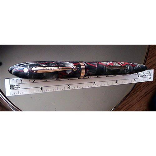 Balanced lifetime red-veined gray and black marbled radite plastic Sheaffer lever-filling fountain pen made in 1935 in excellent condition. Has two toned gold and silver palladium nib wries with medium grade iridium. No personalized engraving, brassing or cracks.