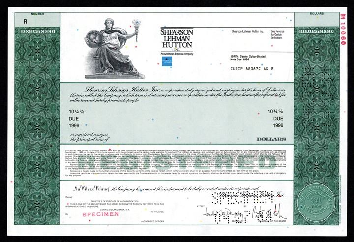 Shearson Lehman Hutton, Inc., 1986 Specimen Registered Bond.