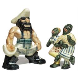 Shearwater figural, muscular pirate with a sword, stamped mark, 8”h, hairline to one foot; with a Shearwater figural, (shown right), two people dancing, stamped mark, 6”h