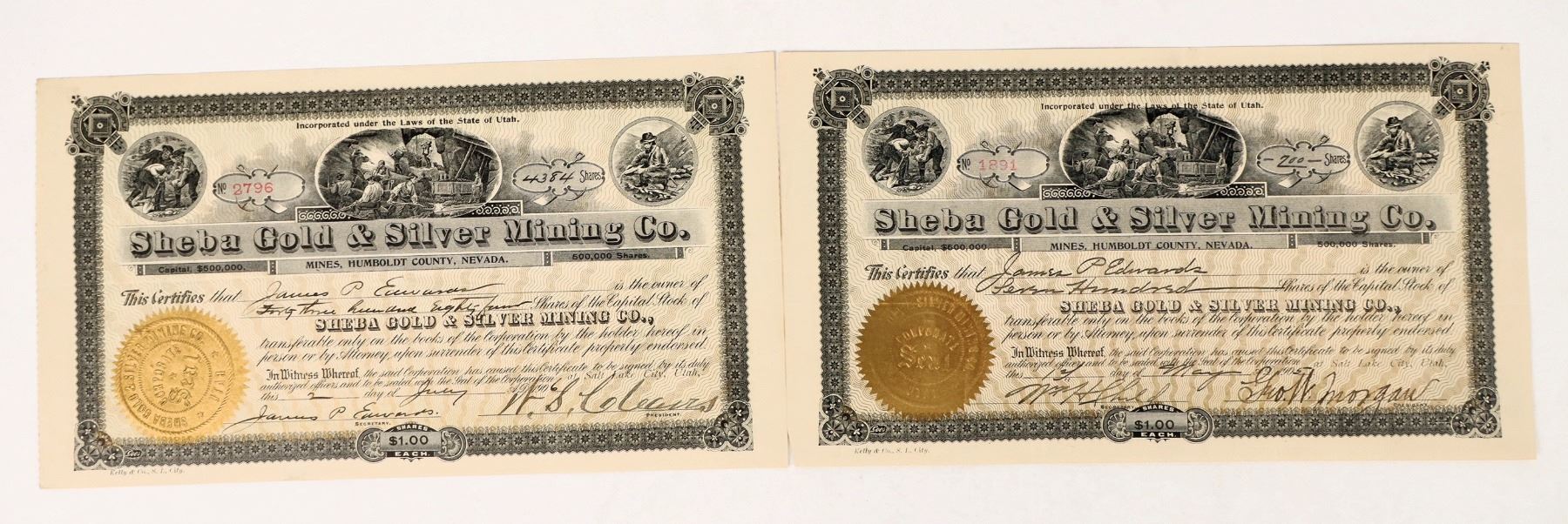 2 Sheba Gold & Silver Mining Co. Stocks 1905-06. Issued to James P. Edwards. Each signed by different Presidents: W. S. Clears and Geo. W. Morgan. James P. Edwards signed as Secretary on one. Gold embossed seals. Nice mining vignettes.