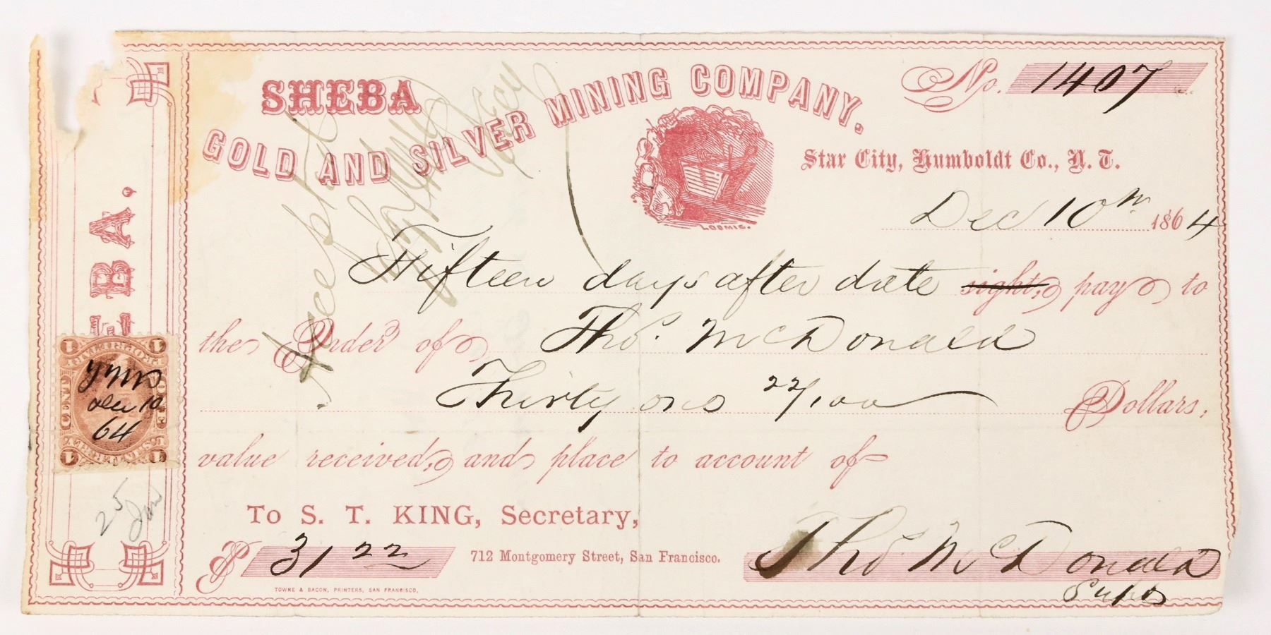 Sheba Gold & Silver Mining Company Draft / Check, Star City, Nevada, 1864 [198150]