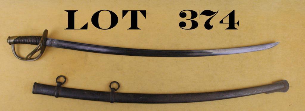 "Sheble & Fisher, Philad a" marked officer's sword and metal scabbard approx. 43" overall with an approx. 35" blade in overall uncleaned good condition; the blade shows a dark patina with good maker's mark at hilt,brass guard with wire wrapped leather grip; metal scabbard shows a heavy dark patina with scattered overall erosion and age pitting; both hanging rings remain present. An old workhorse that could likely tell a lot ofstories if it could speak. Est.: $400-$800.