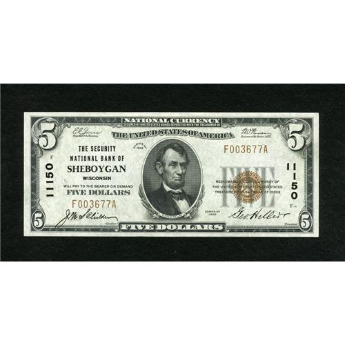 <B>Sheboygan, WI</B></I> - $5 1929 Ty. 1 <B>The Security NB</B></I> Ch. # 11150<BR>This <B>About Uncirculated</B></I> example did not spend much time in commerce in the area as only a light center fold is detected.<BR><BR><b>Shipping:</b> Coins & Currency (<a target="_blank" href="http://www.heritageauctions.com/common/shipping.php">view shipping information</a>)