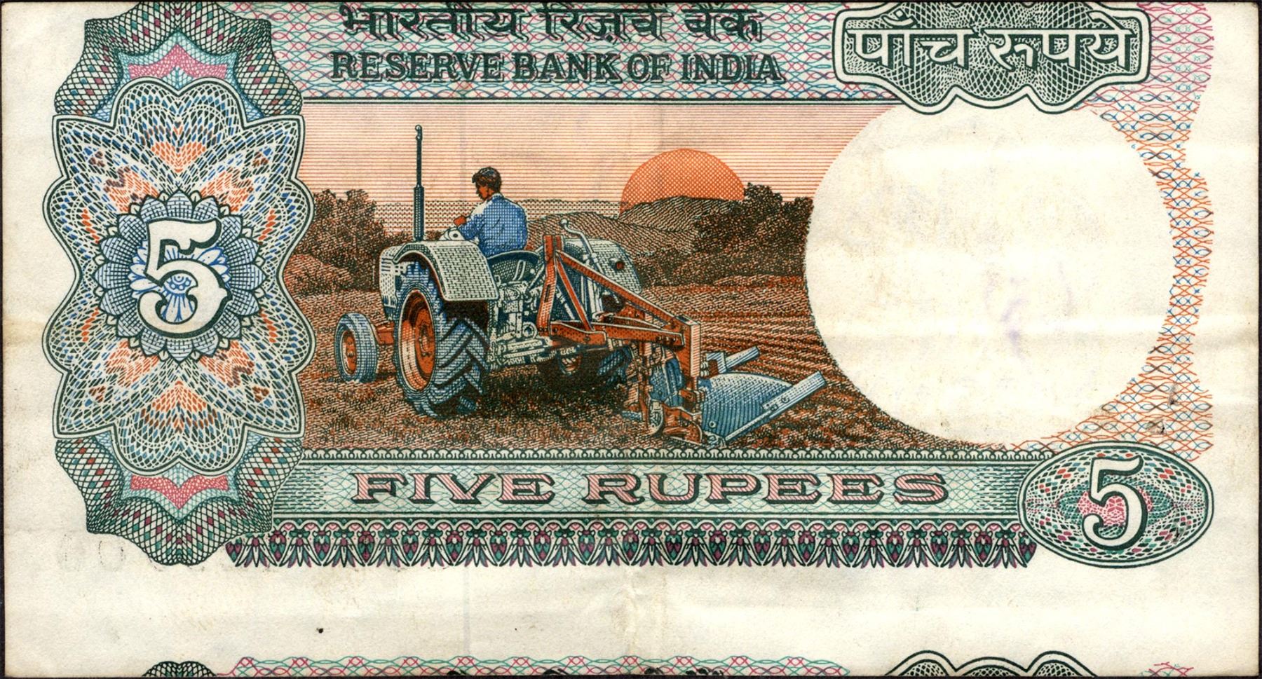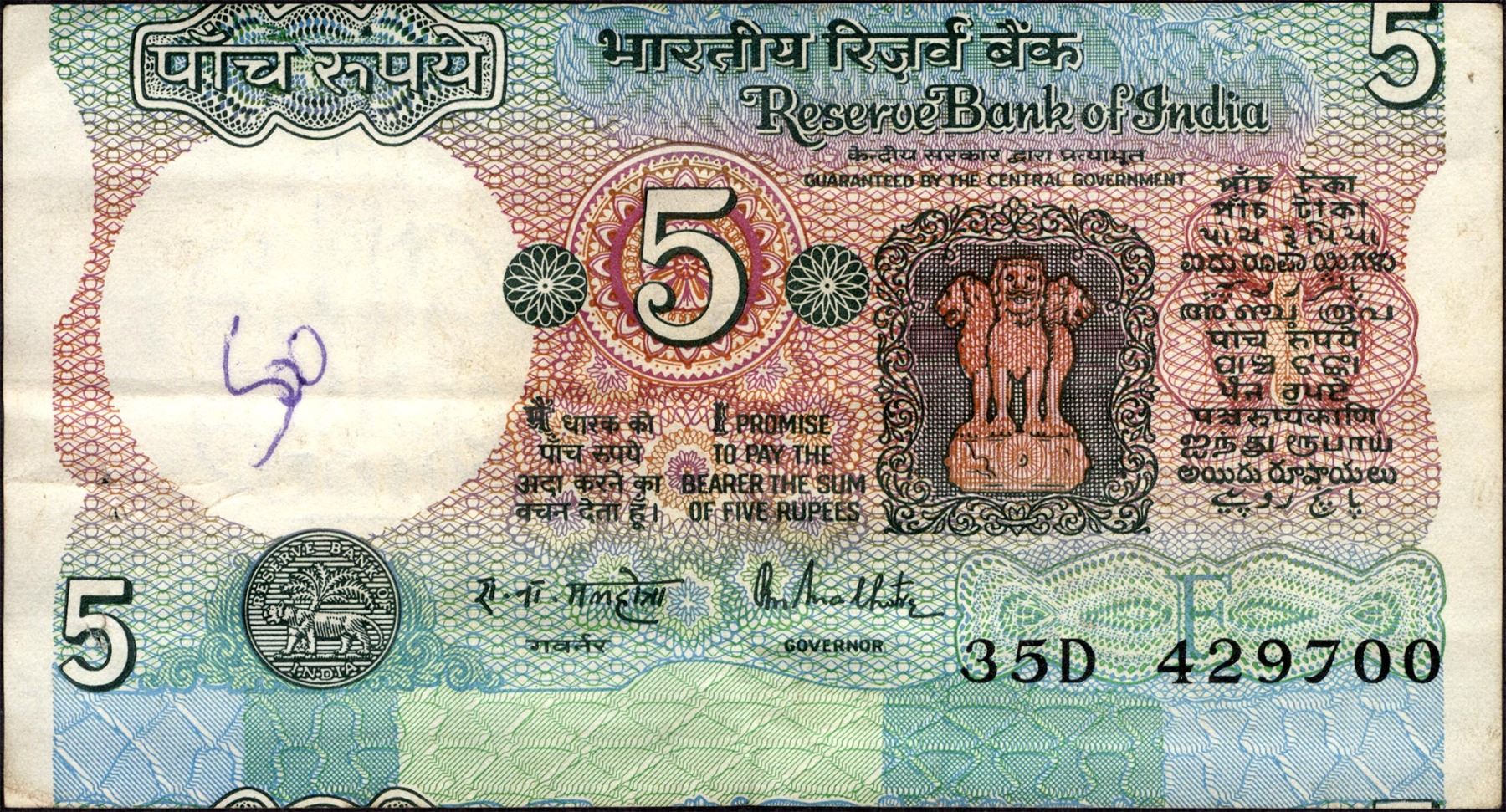 Republic India,1985-1990, Error 5Rupees, Signed byR.N. Malhotra, Error:Sheetcutting error,misaligned cutting, FInset,S. No. 35D 429700,folds, holes, graffiti, about veryfine.