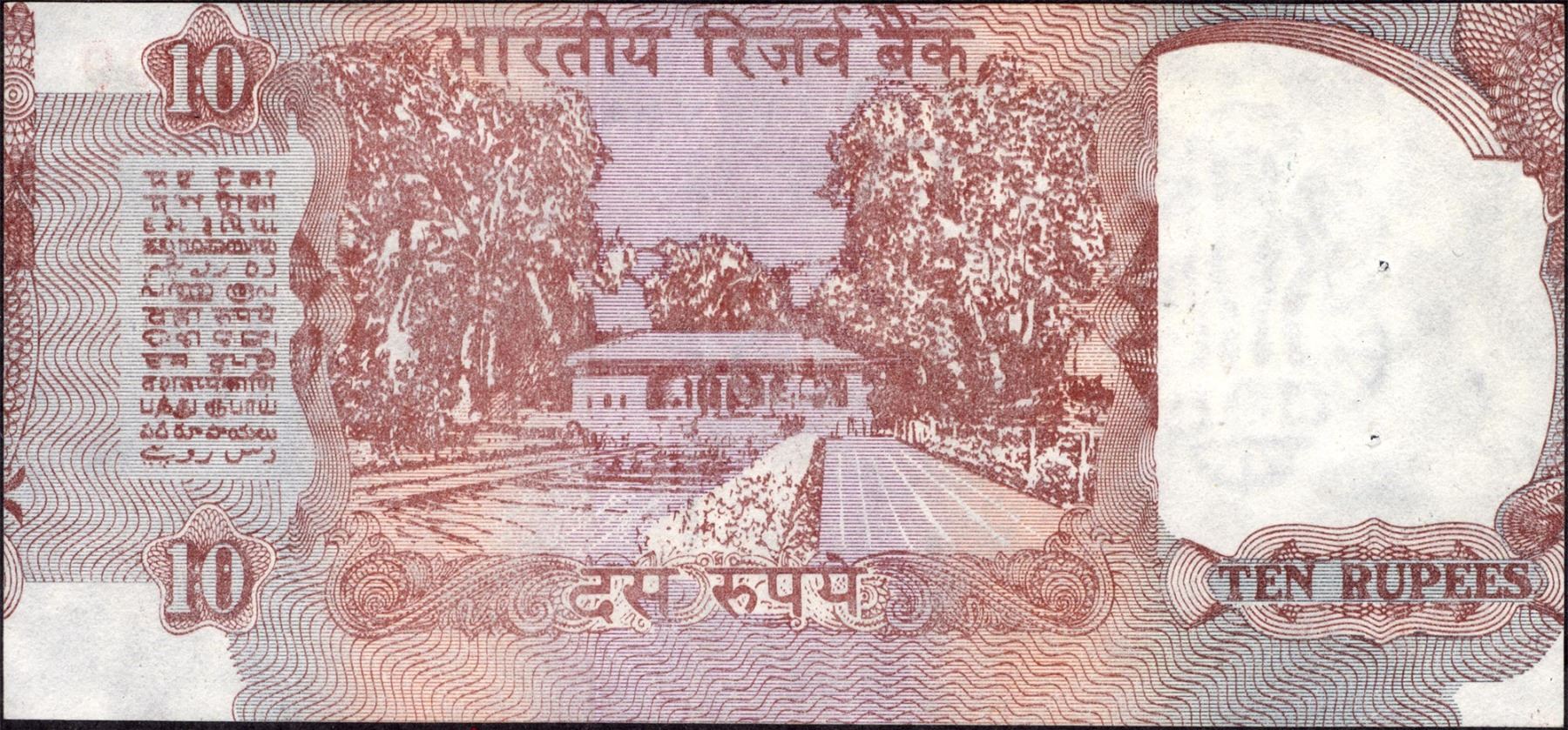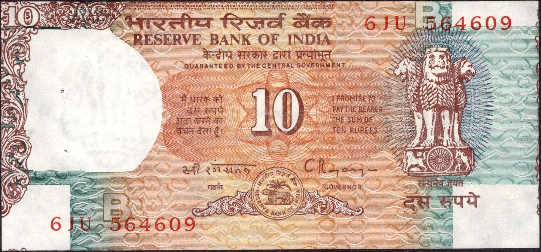 Republic India,1992-1997, Error 10 Rupees, Signed byC. Rangarajan, Error:Sheetcutting error,misaligned cutting, BInset,S. No. 61U 564609,pinholes, crisp paper quality, about extremely fine.