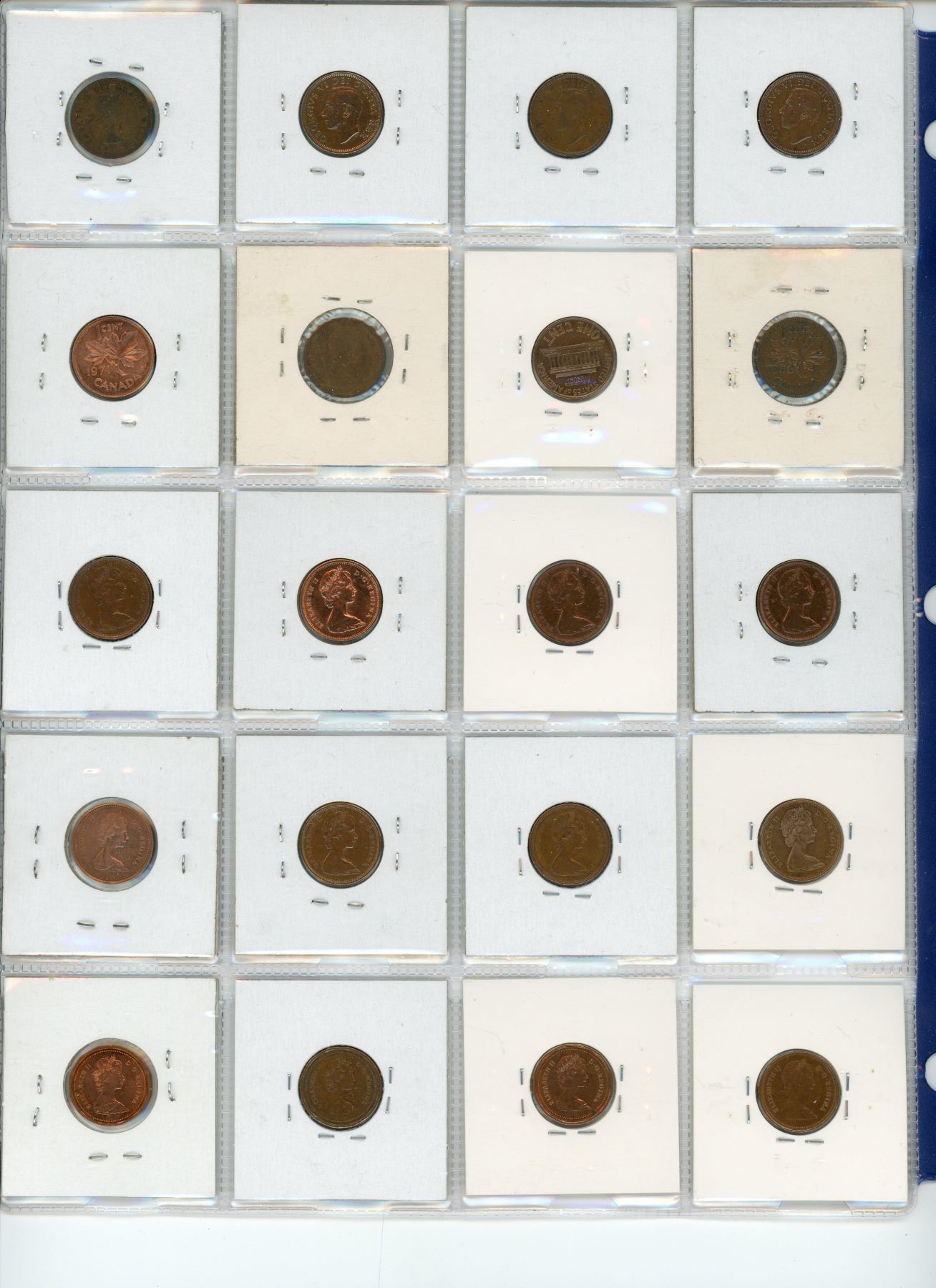 Sheet of 19 assorted Canadian Pennies, 1 US Penny - 1950 to 1985 (US 1969)