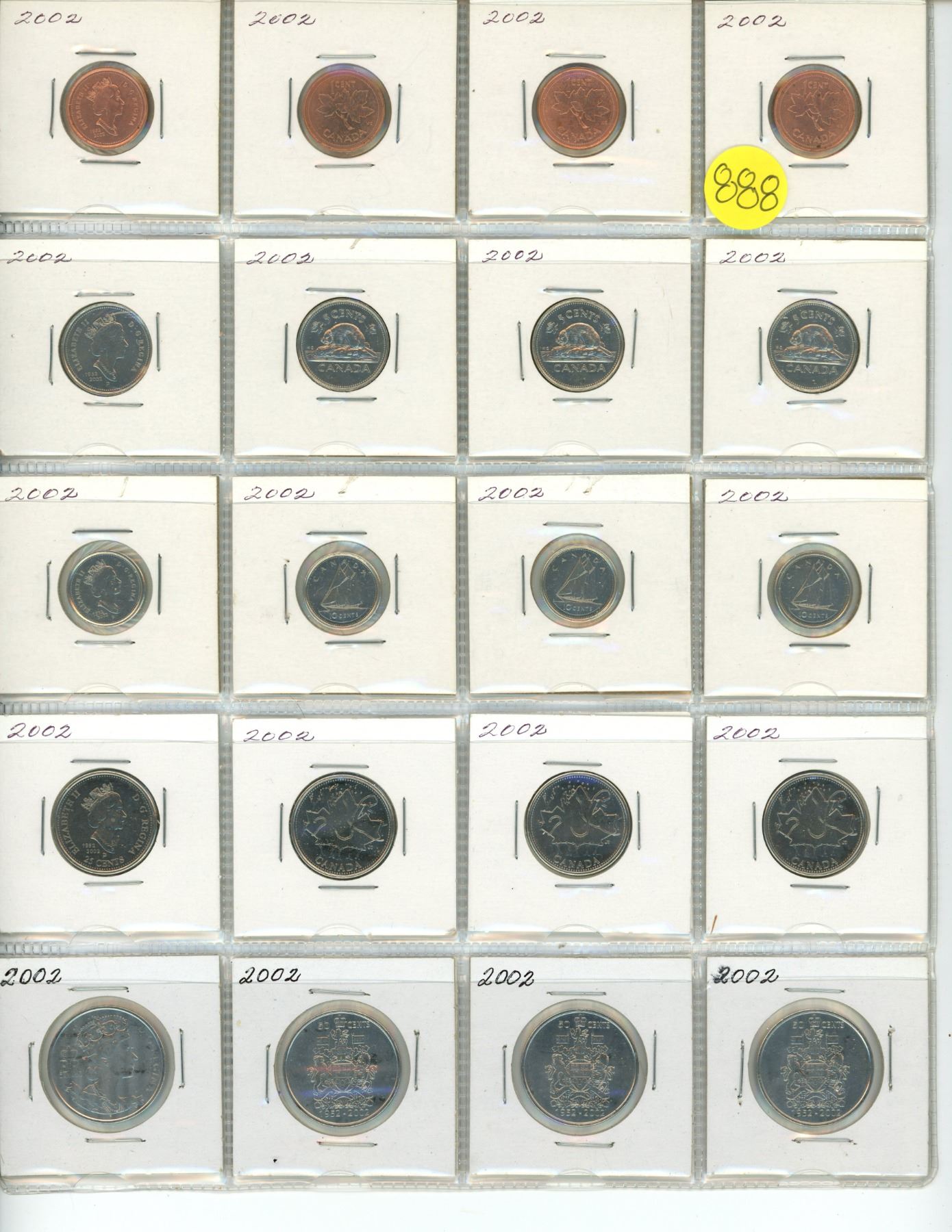 Sheet of 20 2002 Canadian coins - four pennies, four nickels, four dimes, four quarters and four fifty cent pieces. All appear UNC