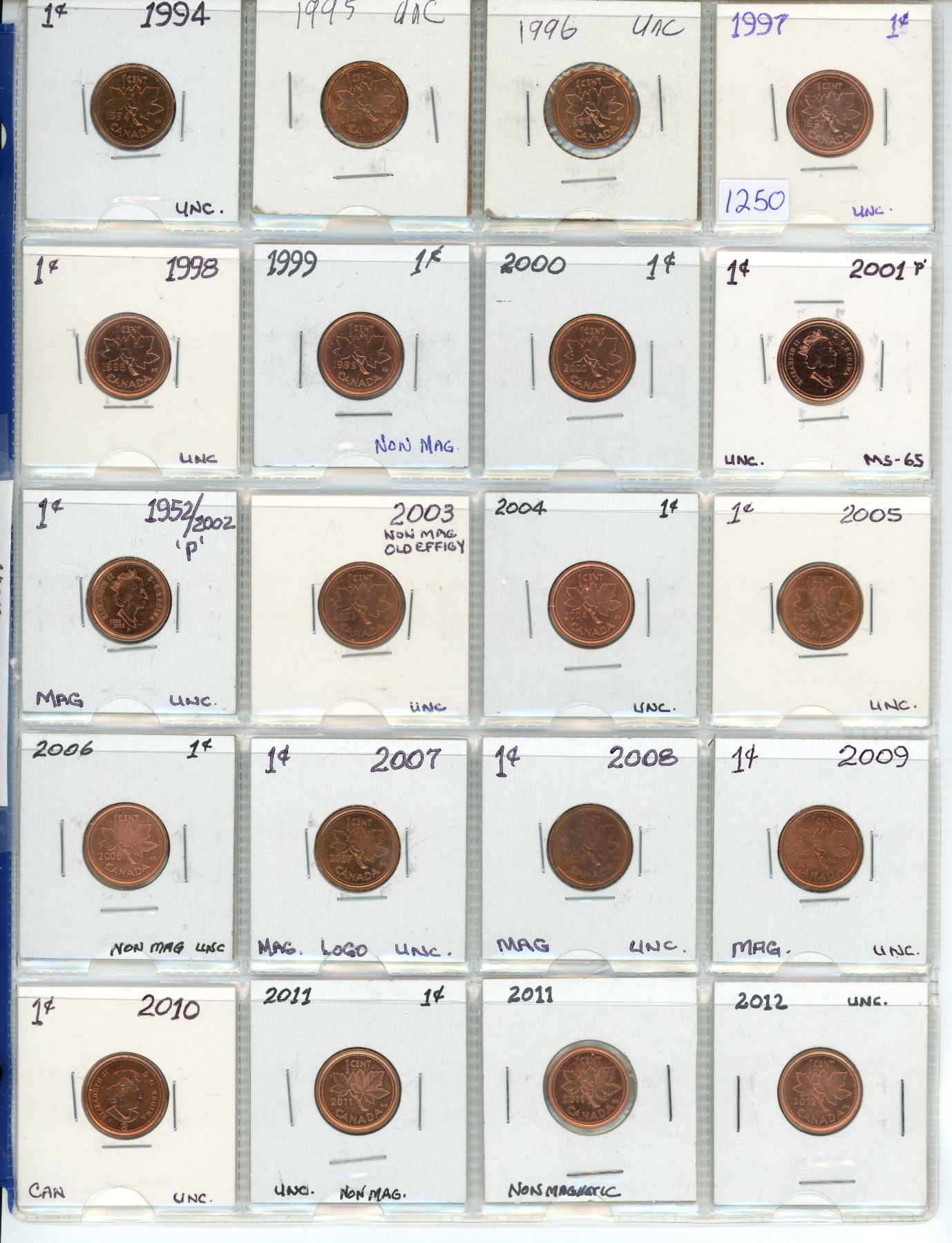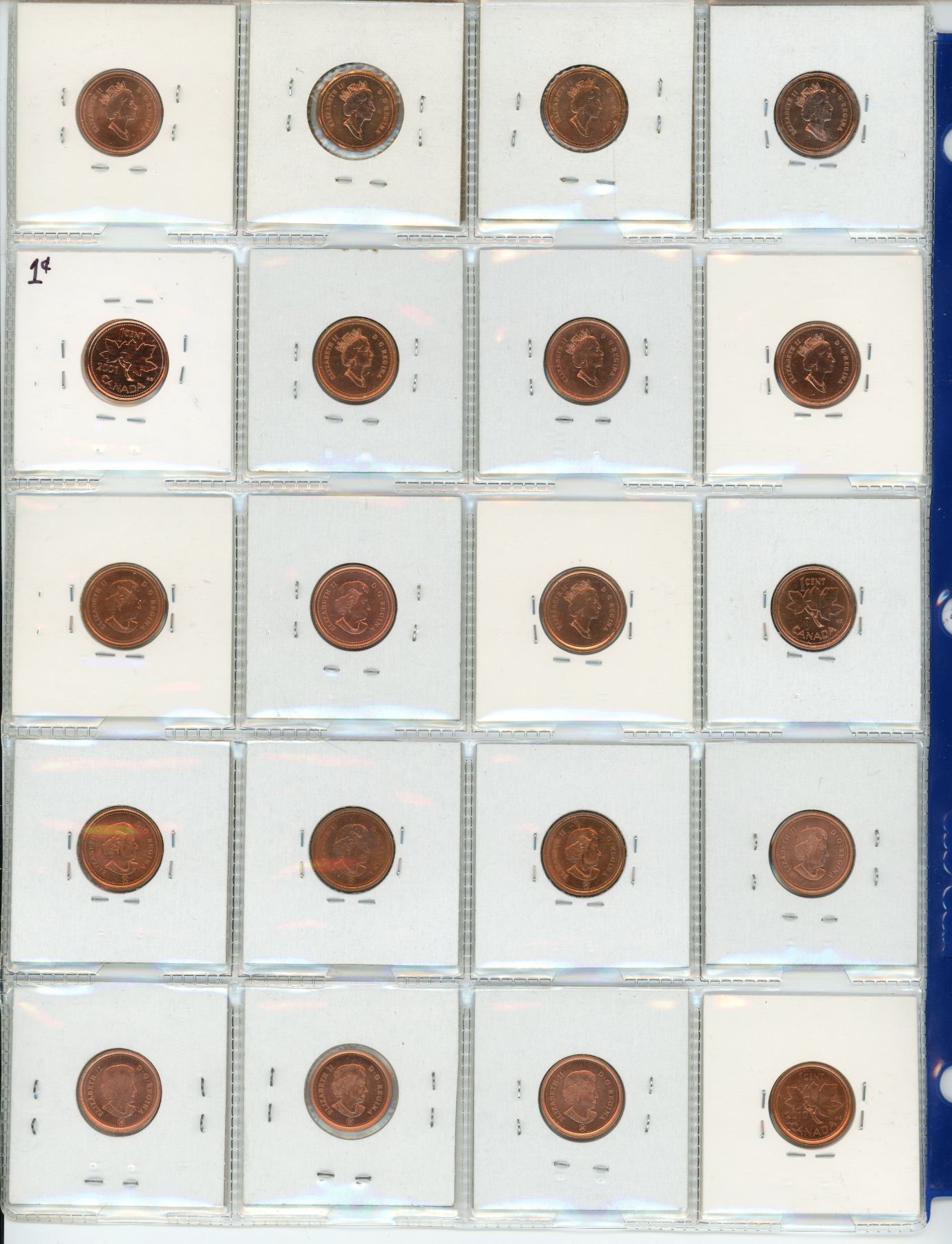 Sheet of 20, Canadian 1 cent penny coins - 1994-2012 mixed