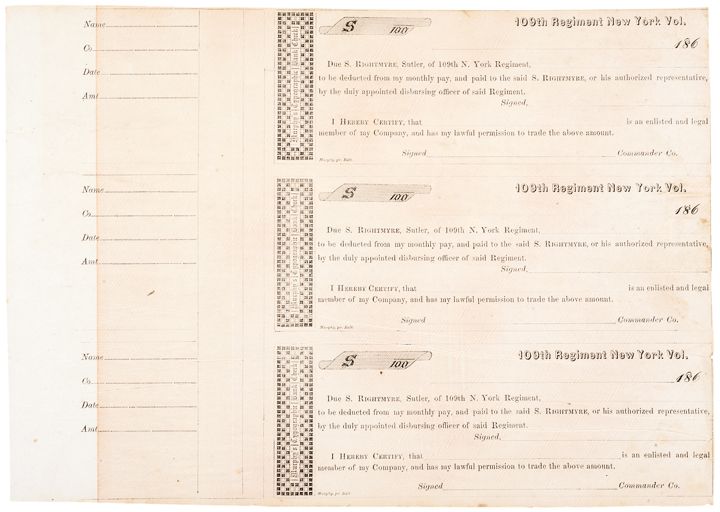 Sheet of Three Unused 109th NY Regiment Sutler Chits