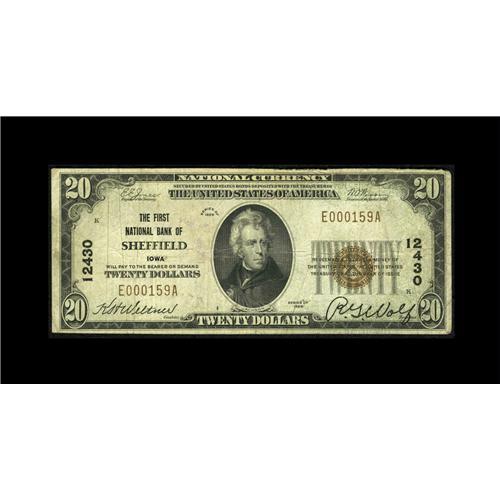 <B>Sheffield, IA</B></I> - $20 1929 Ty. 1 <B>The First NB</B></I> Ch. # 12430<Here is a second chance for the underbidder. This note spent time as a cherished wallet piece leaving it with a small stretch of top edge roughness. <B>Fine.</B></I>