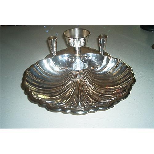 Lovely shell designed tray with two candle holders and one small bowl that is removeable. Some small pitting in the bottom of the shell designed tray. Otherwise in excellent condition. Bottom displays: SHEFFIELD SILVER CO. MADE IN USA. Also in the circle has the initials of HLZ. Four claw designed legs. A lovely silverplated tray by Sheffield. Measurements are: 10 1/2 inches long by 10 3/4 inches wide. Very good to excellent condition.
