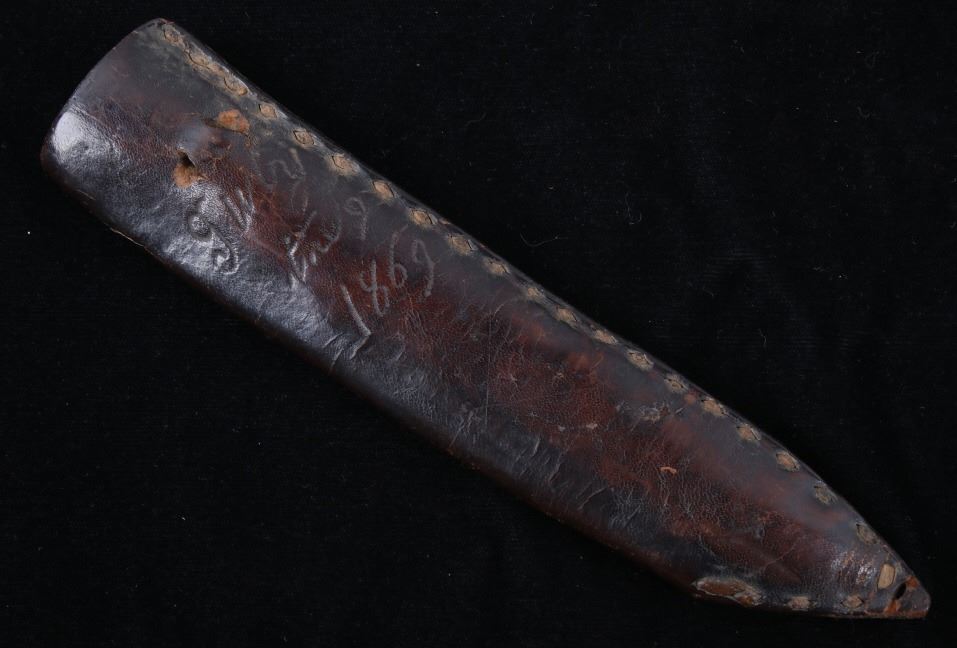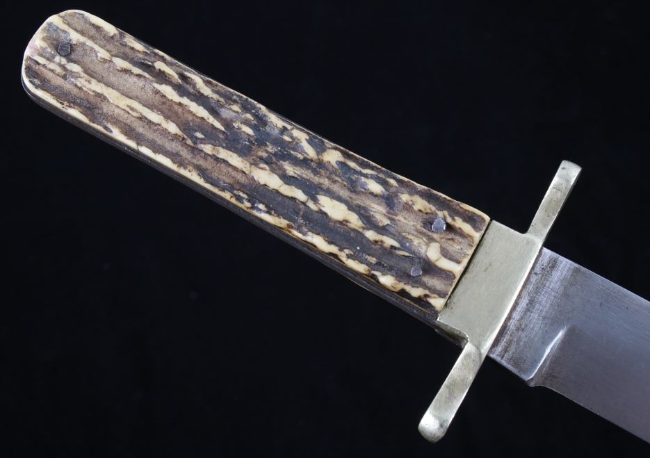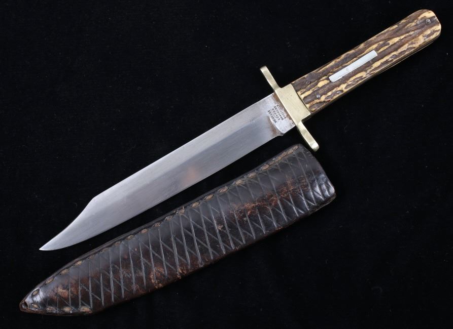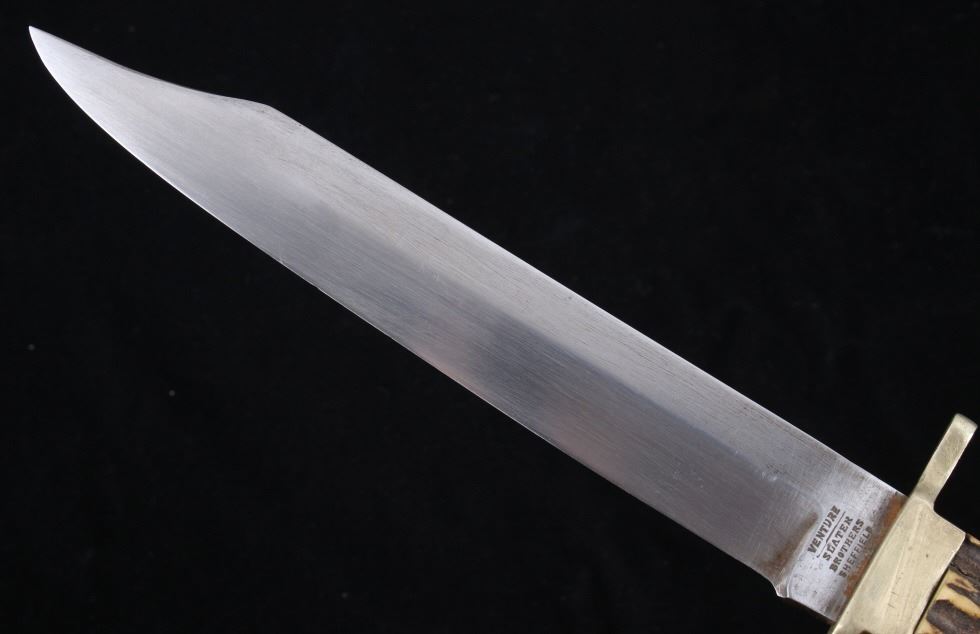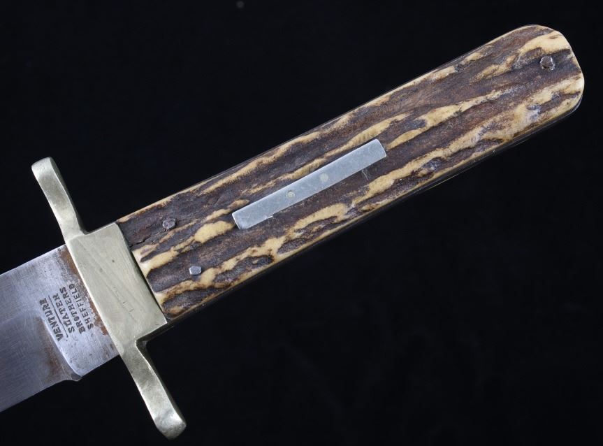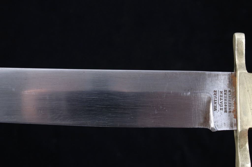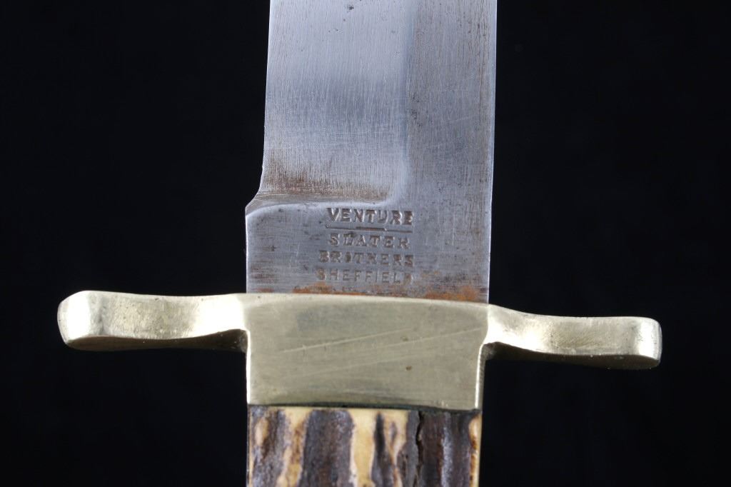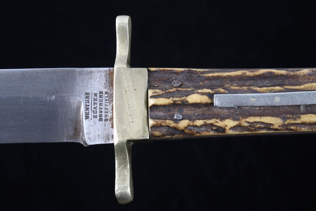 Included in this lot is a Slater Brothers Sheffield Venture clip point knife and sheath. The knife displays steel construction, brass guard, and antler grip handle. The knife blade features a clip point, single edge blade marked near the guard, "Venture Slater Brothers Sheffield". The guard displays brass construction with antler scale grips set with three pins. The knife comes with a custom leather sheath, with the back marked with the crafter’s name and dated 1869. The knife shows good condition overall, with some wear due to age. The knife measures 10 3/4" long, with the blade being 6 1/2" long.