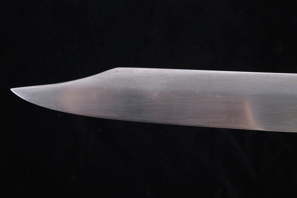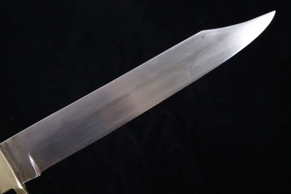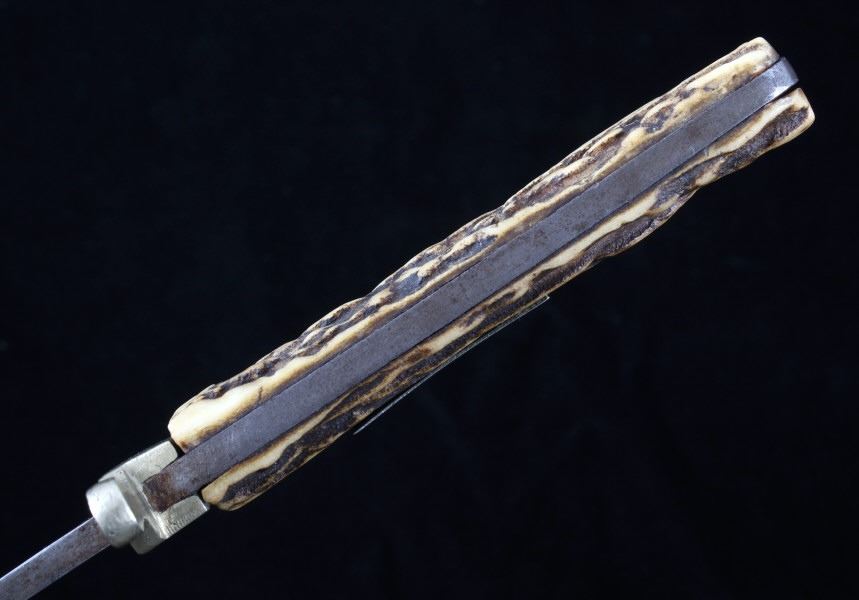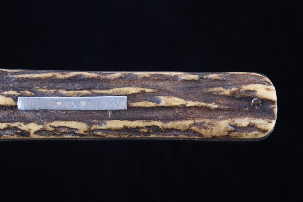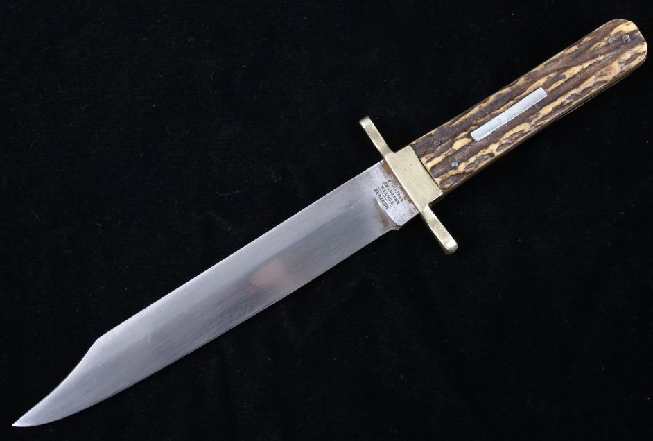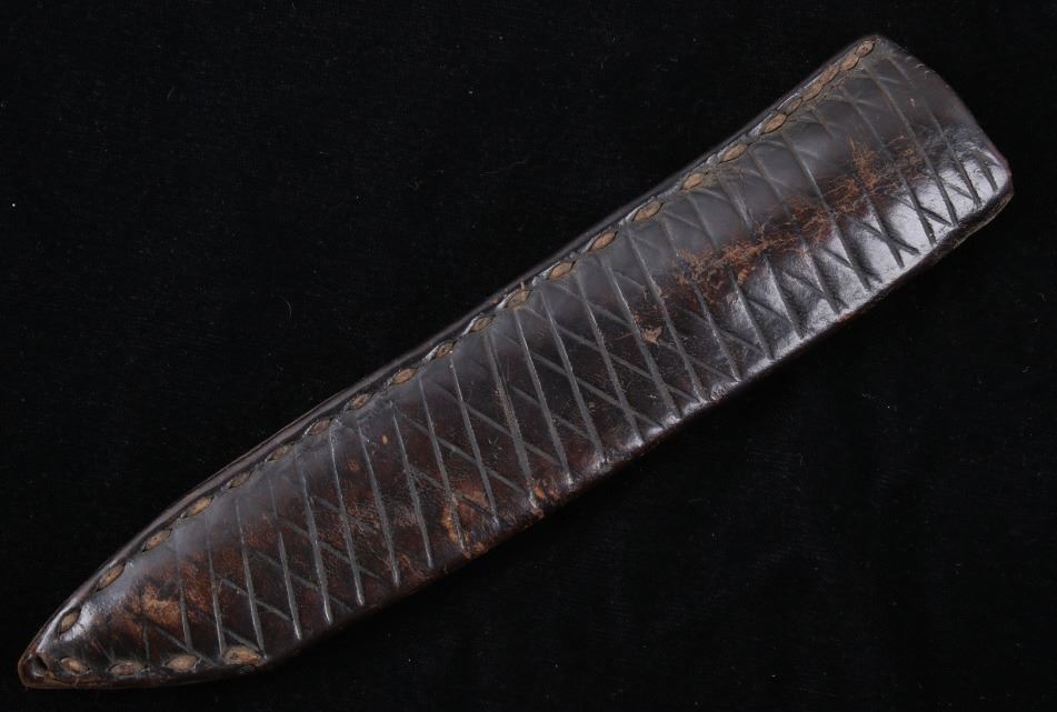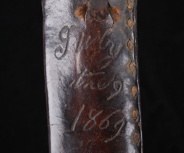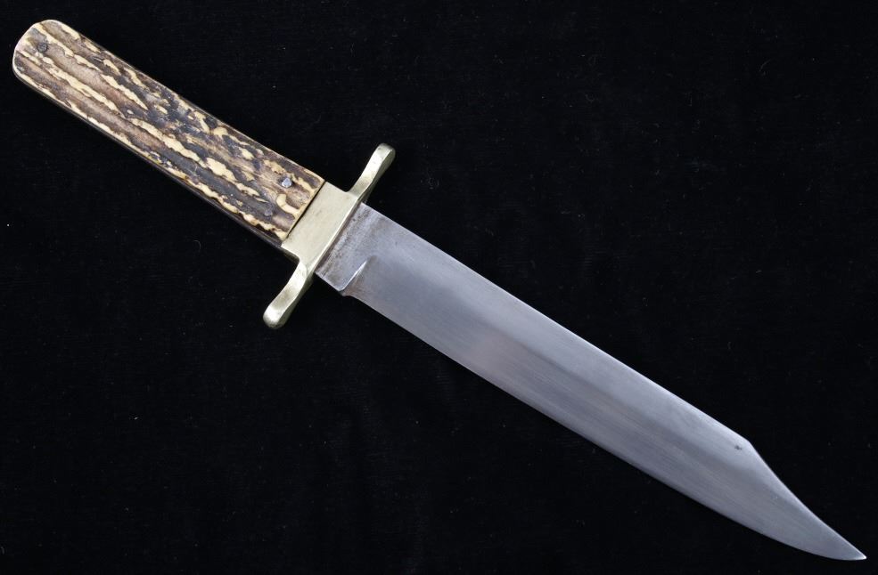 Included in this lot is a Slater Brothers Sheffield Venture clip point knife and sheath. The knife displays steel construction, brass guard, and antler grip handle. The knife blade features a clip point, single edge blade marked near the guard, "Venture Slater Brothers Sheffield". The guard displays brass construction with antler scale grips set with three pins. The knife comes with a custom leather sheath, with the back marked with the crafter’s name and dated 1869. The knife shows good condition overall, with some wear due to age. The knife measures 10 3/4" long, with the blade being 6 1/2" long.