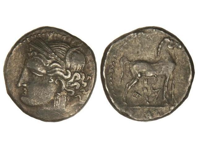 Shekel. - 241-238 a.C. - ZEUGITANIA. CARTAGO. REVUELTA LIBIA. - Anv.: Cabeza de Tanit a izquierda. Rev.: Caballo parado a derecha, entre las patas del caballo dos letras púnicas. 7,60 grs. AR, plata baja. Pátina. Se-6540. MBC+. - -