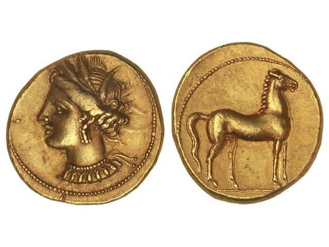 Shekel-Didracma. - 290-280 a.C. - CARTAGO. - Anv.: Cabeza de Tanit con corona a izquierda. Rev.: Caballo en pie a derecha. 9,15 grs. AU electrón. (Pequeños golpecitos y rayitas en anverso). Se-6465 sim. EBC-/EBC. - -