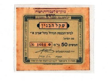 Shekel Habinyan - receipt for donation to the Great Synagogue in Tel Aviv, Eitan and Shoshani Print, Tel Aviv, with ink stamp at the heading reading 'Mukdash Leavodot Hatiya 1929', in good condition: some foxing at the edges, paper slightly yellow. Dimensions: 12x10 cm.
