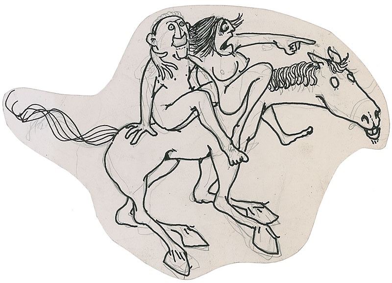 Unsigned ink sketch of a nude couple on a galloping horse, with the woman pointing in horror to an unseen menace in front of the horse, drawn by Silverstein on an off-white sheet of light cardstock trimmed to a size of 6.75 x 4.5. In fine condition. From 1957 to 1968, Silverstein created 23 travel installments for Playboy magazine called "Shel Silverstein Visits…" One of his locations was a New Jersey nudist colony, and this sketch may have been used for his Playboy travel series. Accompanied by an unsigned 50th anniversary edition of The Giving Tree.