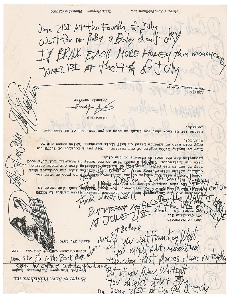 Handwritten working manuscript signed twice by Silverstein, one page both sides 8.5 x 11, on a TLS sent to him by Harper & Row, dated March 27, 1979. On the front, Silverstein has drawn a self-portrait sketch, signed twice to the right side, and penned a draft of the lyrics for what would become ‘June 25th at the Fourth of July,’ performed on his 1980 album The Great Conch Train Robbery and Other Songs, in part: “He said Good Bye Baby / Florida Darlin I’m sailin today / And what we’ll be carryin I really can’t say / But meet me for coffee the Night I arrive / At June 21st at the 4th of July.” On the reverse, he penned the titles of 14 of his songs, likely as a preliminary track listing for the album. Scattered creases and a couple small edge tears, otherwise fine condition. Accompanied by a 50th Anniversary Edition book of Silverstein’s The Giving Tree. This one-of-a-kind draft demonstrates Silverstein’s spontaneous creative process, drafting lyrics on whatever paper he had available at the time.