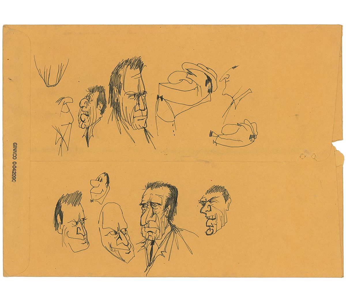 Wonderful assemblage of 11 ink sketches by Silverstein of detailed and cartoonish faces on the reverse of a manila 12 x 9 envelope, originally sent from Capitol Hill Theatre to John Berry Productions, postmarked November 22, 1975. In fine condition, with a tear to the right edge from opening. Accompanied by an unsigned 50th anniversary edition of The Giving Tree.