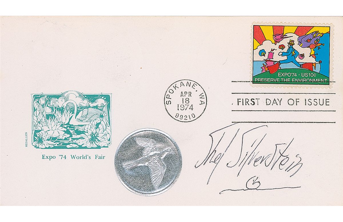 FDC with a cachet honoring Expo ‘74 of the World’s Fair, signed in black ballpoint by Silverstein, adding a quick sketch of a shell under his signature. In fine condition.