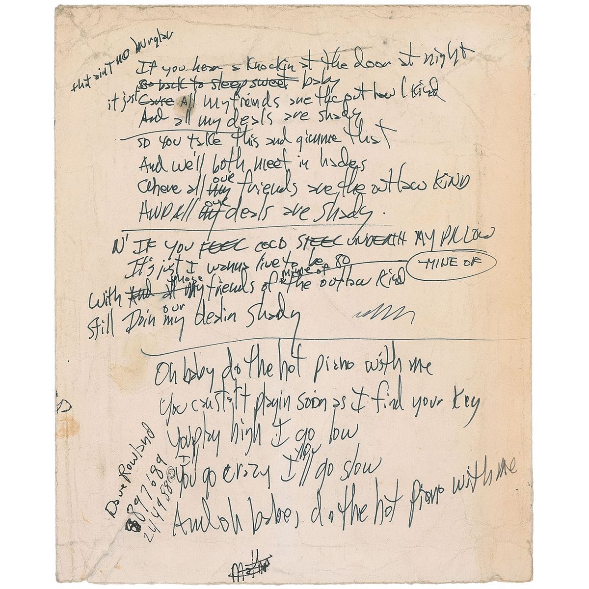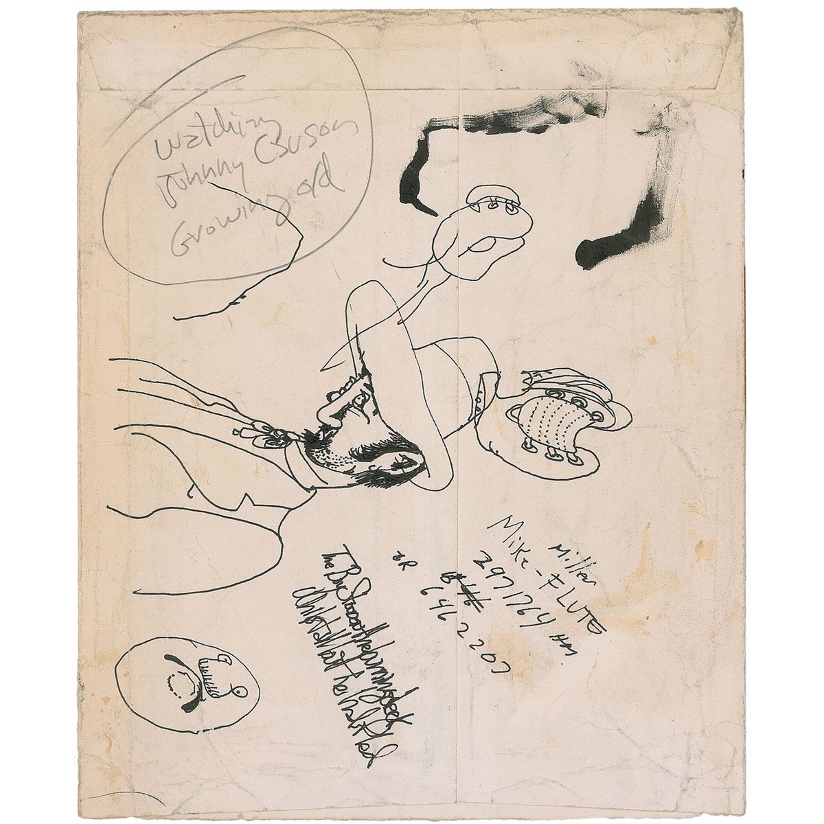 Fantastic felt tip sketch and handwritten draft on both sides of a 8.25 x 10 manilla envelope. On one side, Silverstein has drawn a large and whimsical man dressed in outlaw-style Western garb, as well as a less-defined face and two baseball gloves. On the opposing side, Silverstein has penned a lengthy draft of a poem or lyrics, in part: “If you hear a knockin at the door at night / that aint no burglar baby / it just cause all my friends are the out law kind / And all my deals are shady / so you take this and gimme that / And we’ll both meet in hades.” In very good condition, with moderate scattered creases and staining. Accompanied by an unsigned 50th anniversary edition of The Giving Tree. A highly desirable combination of original artwork and a seemingly unpublished literary piece.