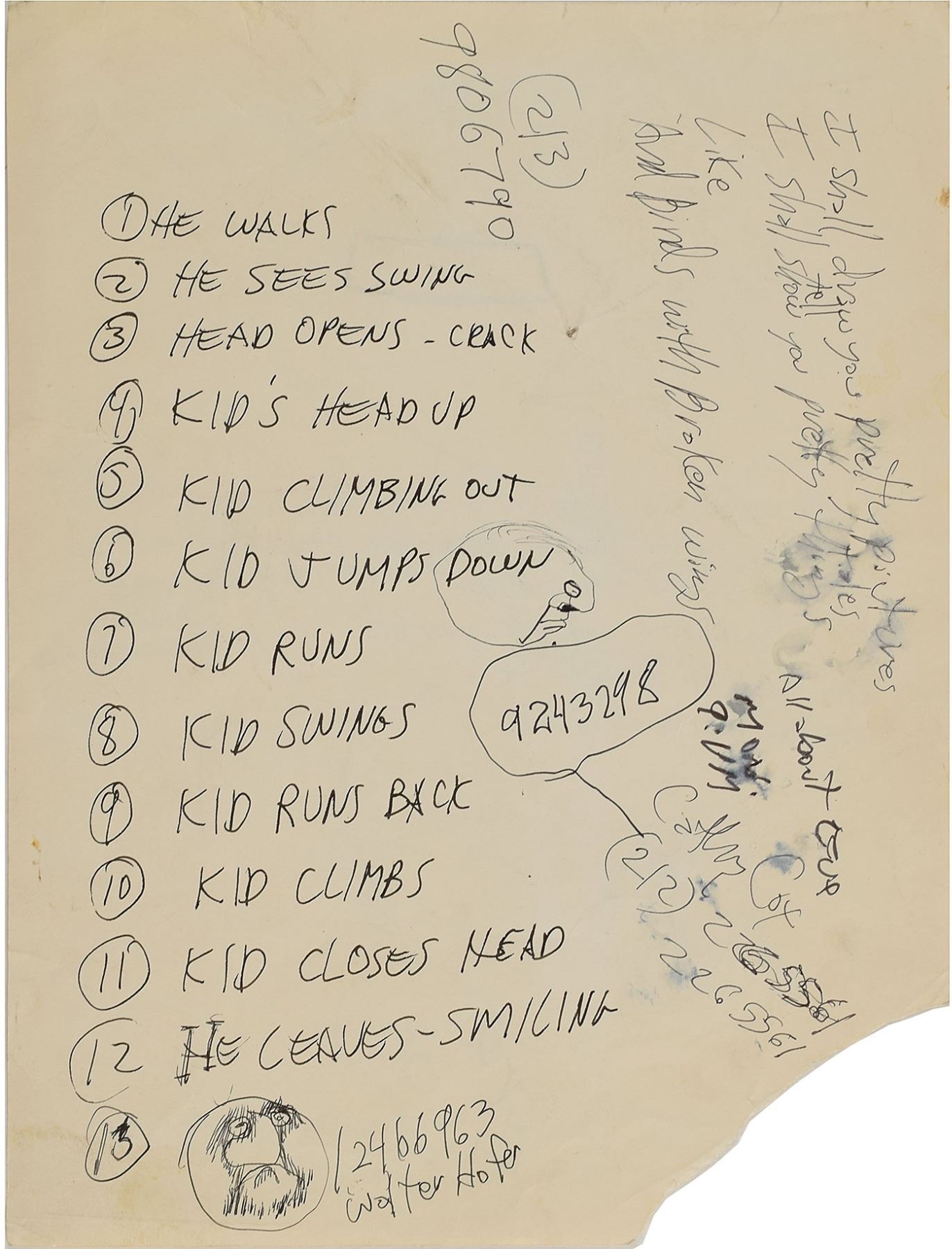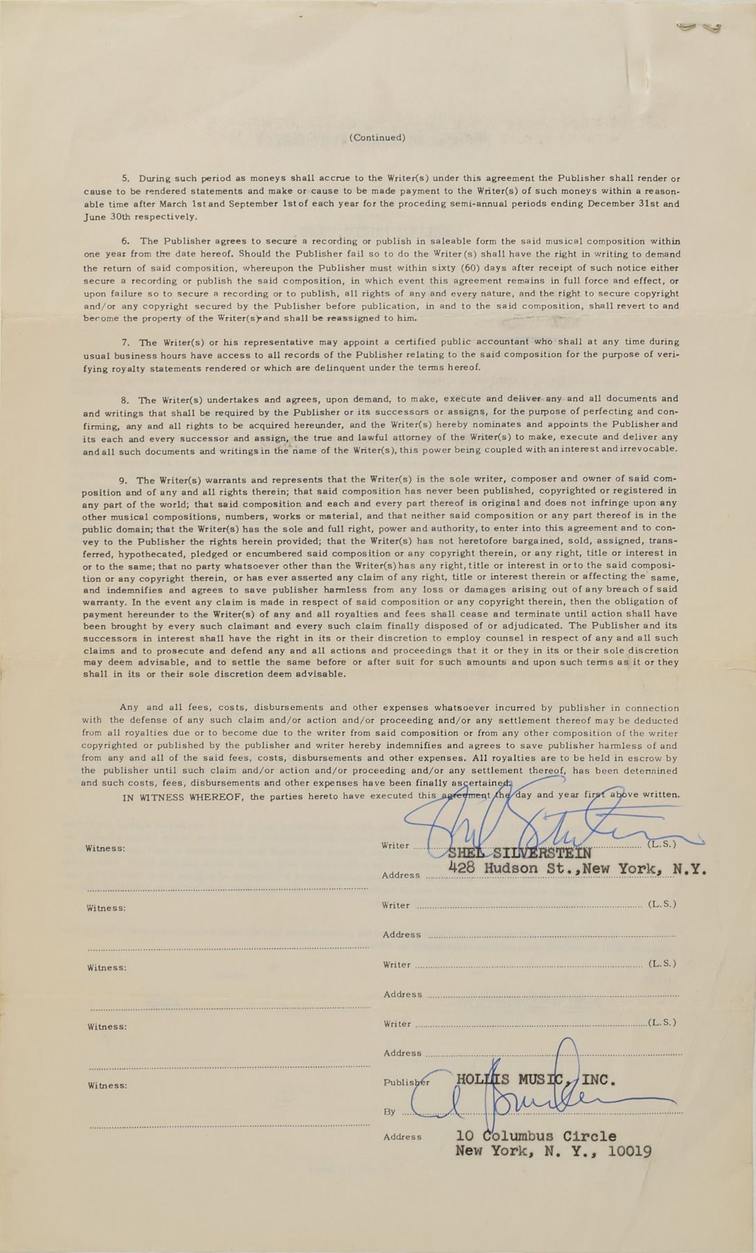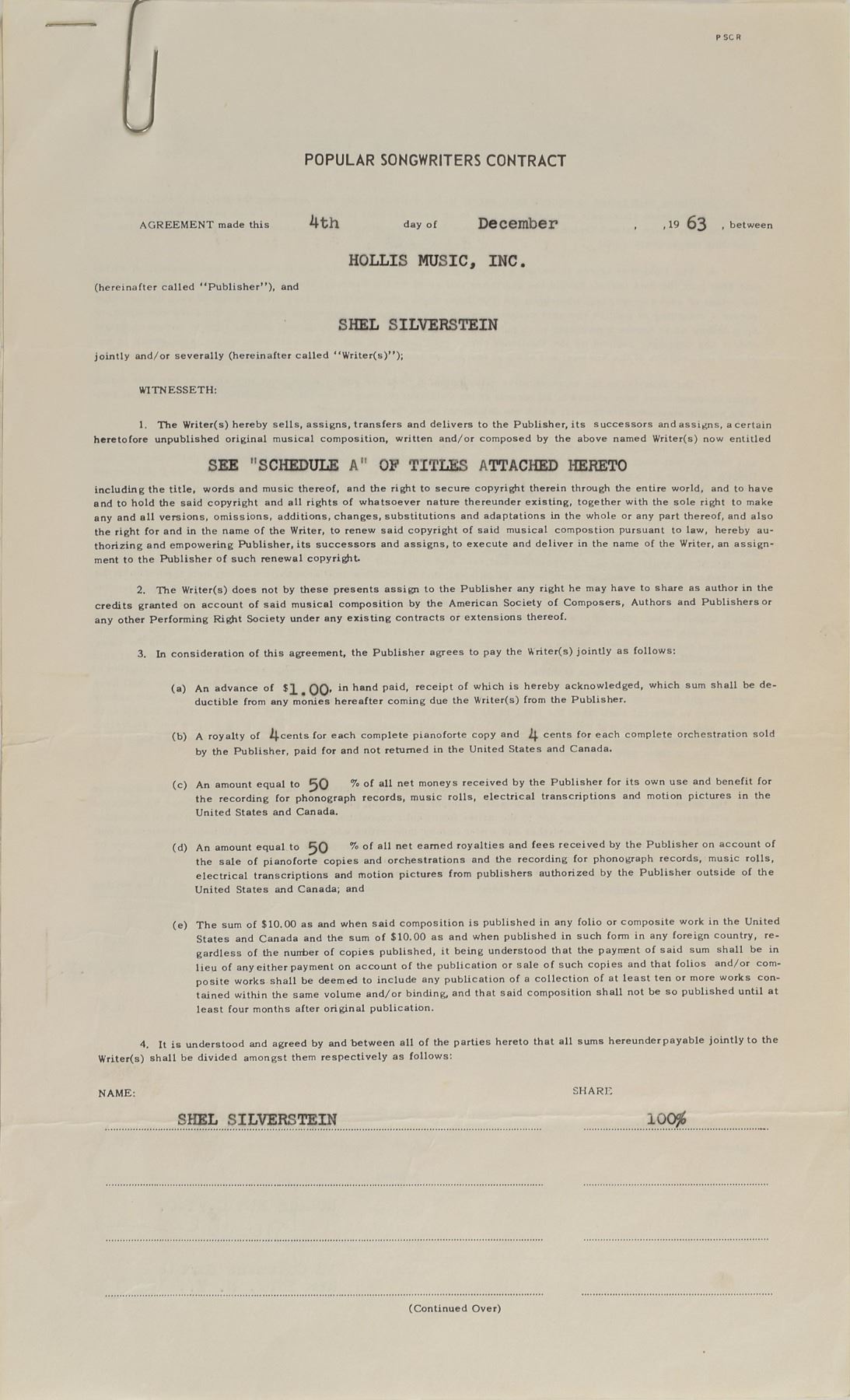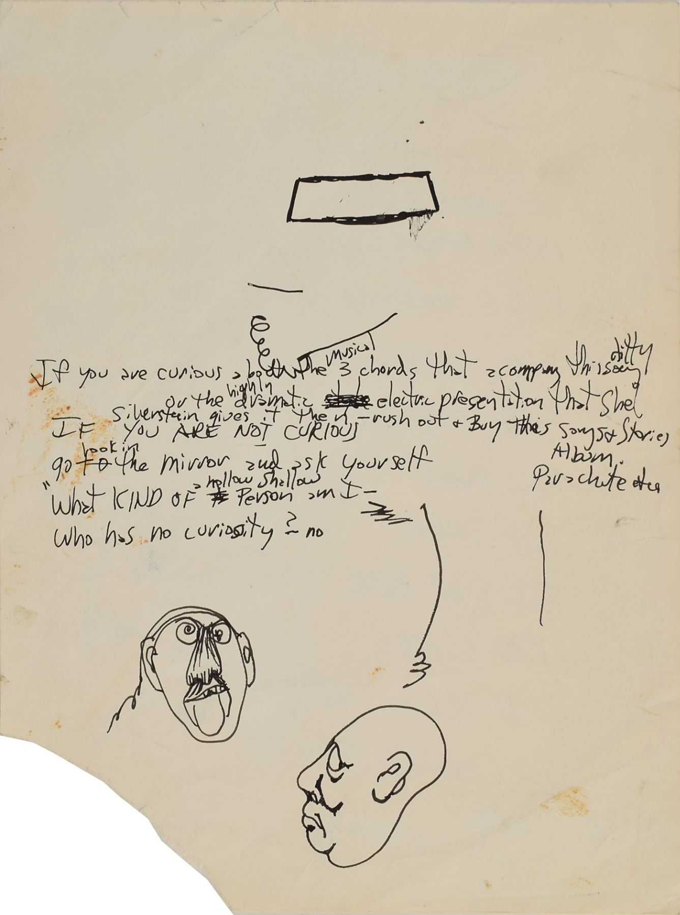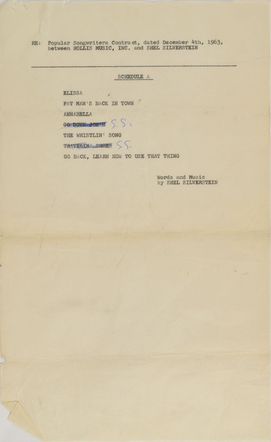 Two items: a DS, 8.5 x 14, two pages, December 4, 1963, a popular songwriter's contract between Hollis Music, Inc., and Silverstein relating to the sale and assignment of original musical compositions entitled: "Elissa," "Fat Man's Back in Town," "Annabella," "The Whistlin' Song," and "Go Back, Learn How to Use That Thing." Silverstein signs at the conclusion of the second page in blue ballpoint, and has struck through two song titles on the attached "Schedule A" sheet, adding his initials, "S. S.," to both edits. The second item is an off-white 9 x 12 sheet bearing numerous handwritten notes made in black ink by Silverstein on both sides. The front features facial sketches of bald men and a humorous note: "If you are curious about the 3 musical chords that accompany this ditty song or the highly dramatic electric presentation that Shel Silverstein gives it then—rush out & buy this Songs & Stories Album. If you are not curious go look in the mirror and ask yourself 'What kind of shallow person am I—Who has no curiosity?" The reverse side features several phone numbers and a numbered list detailing a progression of a child's activities: "1. He Walks, 2. He sees swing, 3. Head opens—crack, 4. Kid's head up, 5. Kid climbing out, 6. Kid jumps down, 7. Kid runs, 8. Kid swings, 9. Kid runs back, 10. Kid climbs, 11. Kid closes head, 12. He leaves—smiling," with the last line a sketch of a disgruntled face, which matches another at the end of the sixth line. Along the right side appears to be a short poem: "I shall draw you pretty pictures / I shall tell/show you pretty tales/things / Like / And birds with broken wings." In overall very good to fine condition, with scattered creasing and light staining.
