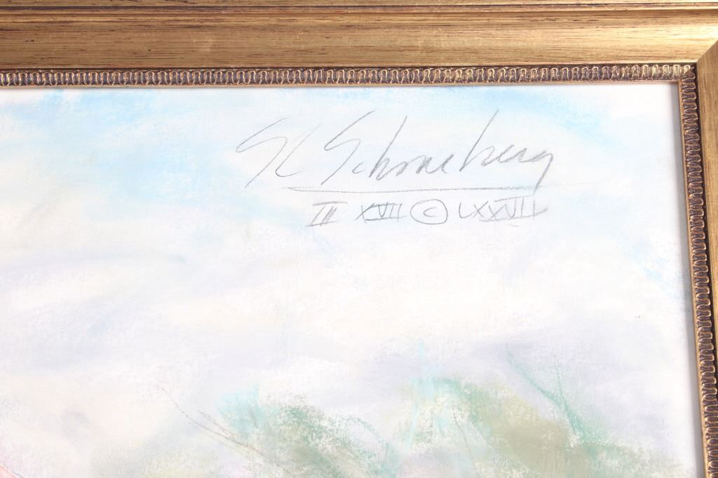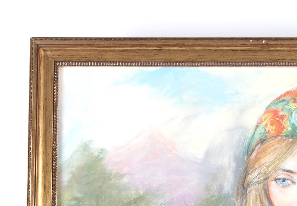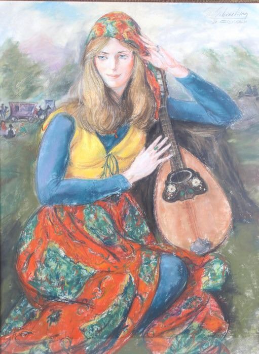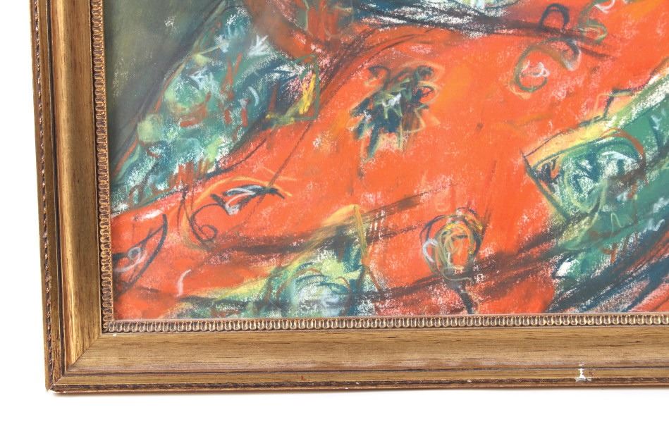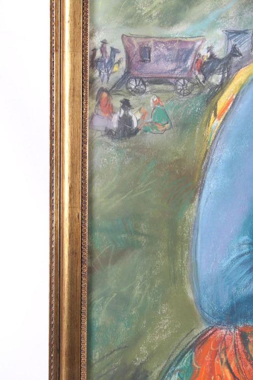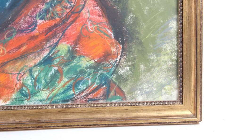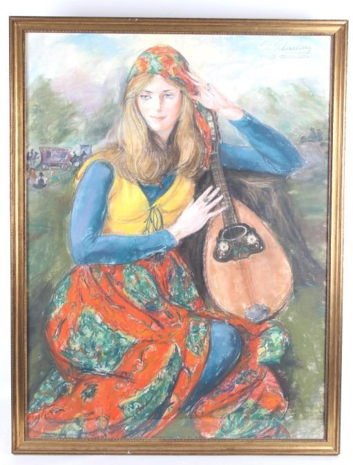 Featured in this lot is this original framed pastel of a gypsy woman by artist Sheldon C. Schoneberg born 1926 and died 2012. The artwork is wonderfully and professionally crafted pastel construciton with vibrant colors adorning the dress and garments of this gypsy woman and holding a lute with her arm propped up on a stump and shows a gypsy camp in the distance. The artist signature can be seen in the top right hand corner and the inscription underneath reads as follows: III XVII C LXXVII. American artist Sheldon Schoneberg, born in 1926 in Chicago, Illinois, is best known for his vibrant, colorful pastel work. Schoneberg touts an impressive resume, having been formally educated at schools such as Los Angeles' Chouinard Art Institute, the University of Southern California, and the Academia di Belle Arti in Rome. Never to leave the world of academia, artist Sheldon Schoneberg went on to teach art at schools like the University of New York and the University of Maine. Sheldon Schoneberg's paintings cover a range of subjects, including female nudes, musicians, gypsies, women adorned with flowers, and young ladies and children. The condition of this pastel artwork is good with no obvious signs of damage and in good overall display condition. The measurements of this framed pastel are 42 1/2" x 32 1/2" and the visible art measures 39 1/2" x 29 1/2".