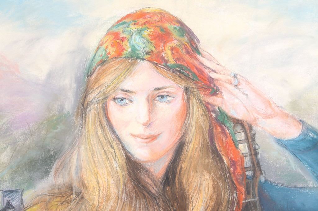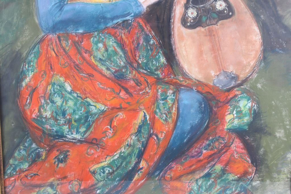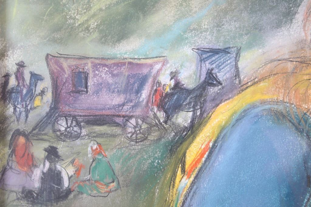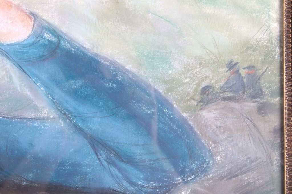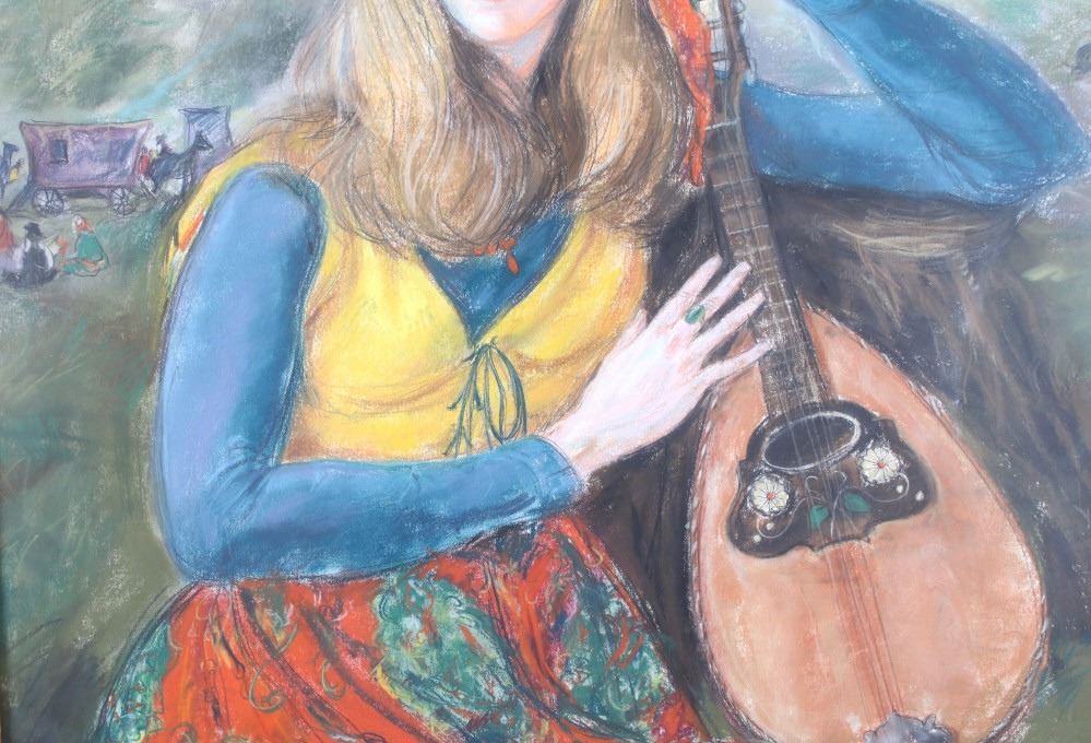 Featured in this lot is this original framed pastel of a gypsy woman by artist Sheldon C. Schoneberg born 1926 and died 2012. The artwork is wonderfully and professionally crafted pastel construciton with vibrant colors adorning the dress and garments of this gypsy woman and holding a lute with her arm propped up on a stump and shows a gypsy camp in the distance. The artist signature can be seen in the top right hand corner and the inscription underneath reads as follows: III XVII C LXXVII. American artist Sheldon Schoneberg, born in 1926 in Chicago, Illinois, is best known for his vibrant, colorful pastel work. Schoneberg touts an impressive resume, having been formally educated at schools such as Los Angeles' Chouinard Art Institute, the University of Southern California, and the Academia di Belle Arti in Rome. Never to leave the world of academia, artist Sheldon Schoneberg went on to teach art at schools like the University of New York and the University of Maine. Sheldon Schoneberg's paintings cover a range of subjects, including female nudes, musicians, gypsies, women adorned with flowers, and young ladies and children. The condition of this pastel artwork is good with no obvious signs of damage and in good overall display condition. The measurements of this framed pastel are 42 1/2" x 32 1/2" and the visible art measures 39 1/2" x 29 1/2".