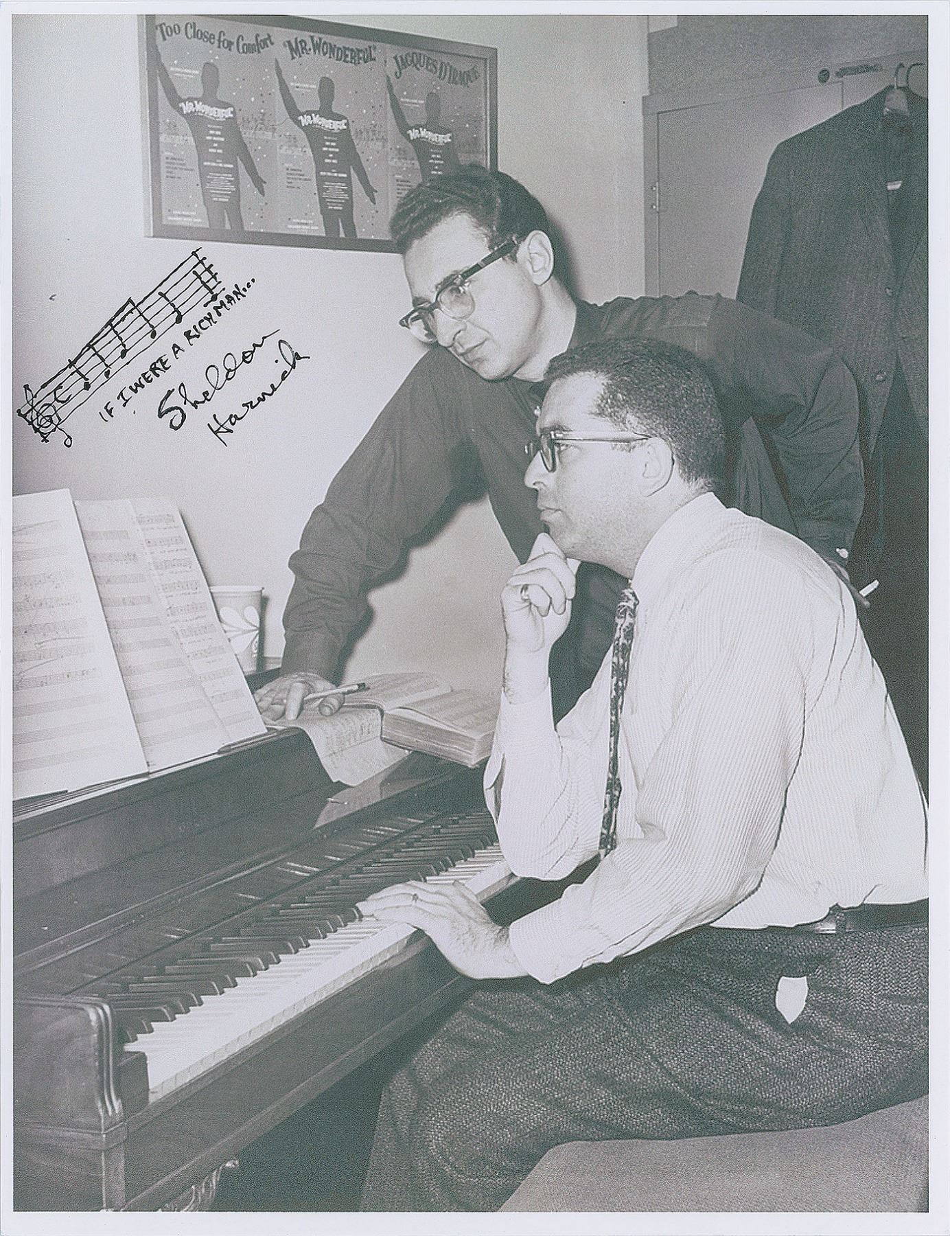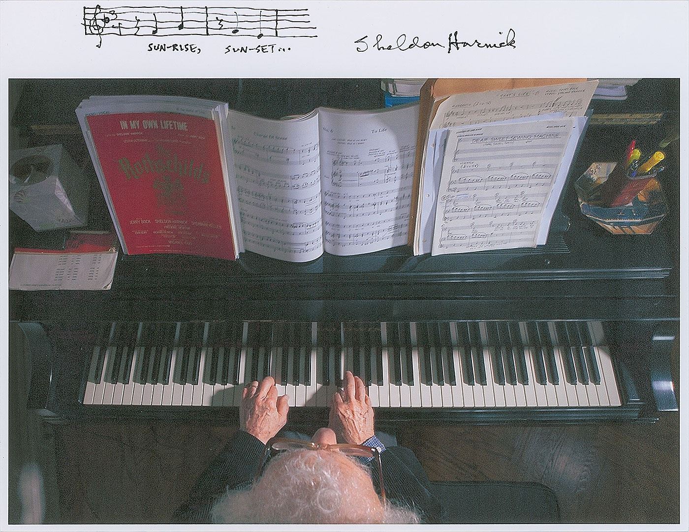 Two photos: an 8.5 x 11 laserprint photo of Sheldon Harnick and Jerry Bock working at a piano, signed in black ink by Harnick, who adds a brief musical quotation from the showtune 'If I Were a Rich Man,' adding the title below; and a color 11 x 8.6 laserprint overhead photo of Harnick playing the piano, signed in black ink by Harnick, who adds a brief musical quotation from the song 'Sunrise, Sunset,' adding the title below. In overall very fine condition.
