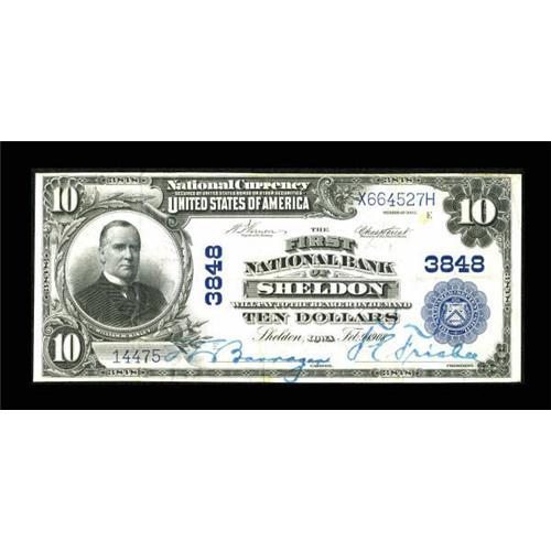 <B>Sheldon, IA</B></I> - $10 1902 Plain Back Fr. 626 <B>The First NB</B></I> Ch. # 3848<BR> This is a more challenging bank to locate than the census figures would imply. Tonight's example is a still quite crispy <B>Very Fine-Extremely Fine</B></I> with vivid blue stamped signatures.<BR><BR><b>Shipping:</b> Coins & Currency (<a target="_blank" href="http://www.heritageauctions.com/common/shipping.php">view shipping information</a>)