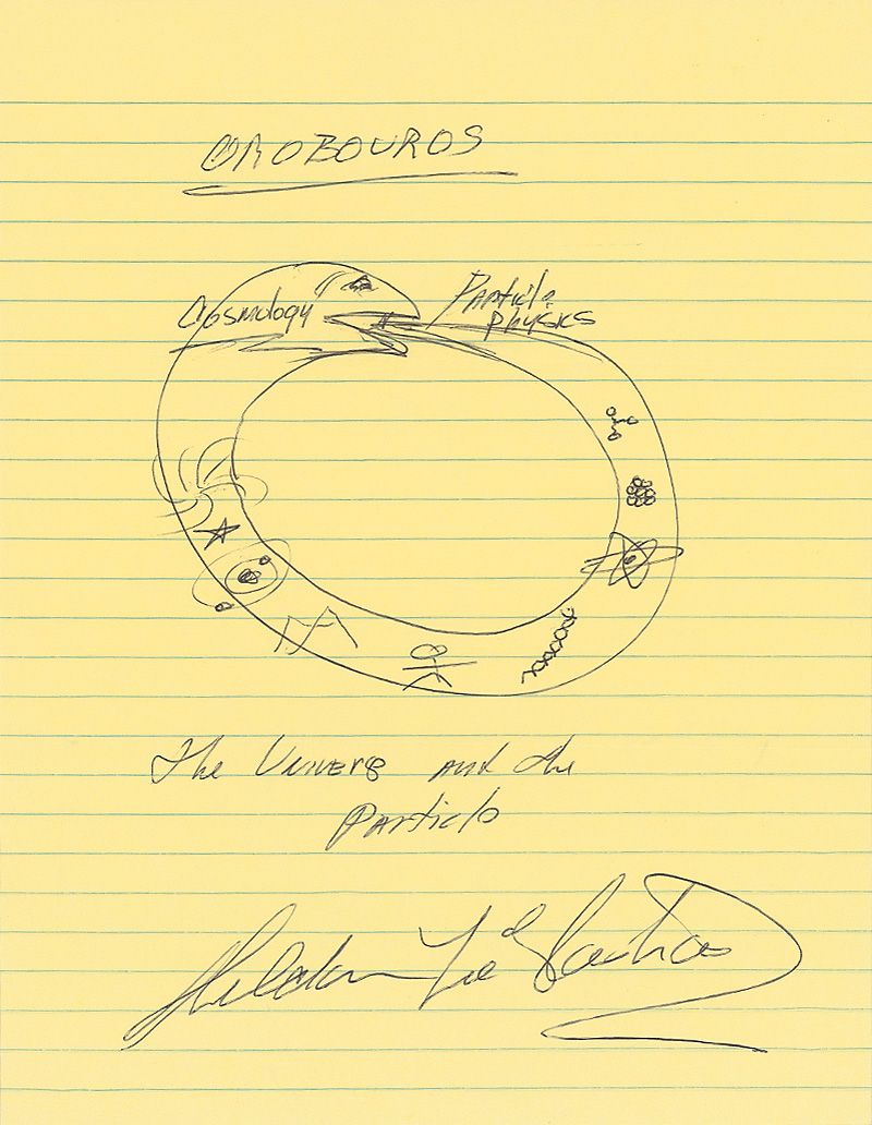 Theoretical physicist who won the 1979 Nobel Prize in Physics. Original signed ballpoint sketch of Ouroboros on a yellow 8.5 x 11 lined sheet, titled “The Universe and the Particle.” In fine condition, with two horizontal mailing folds.