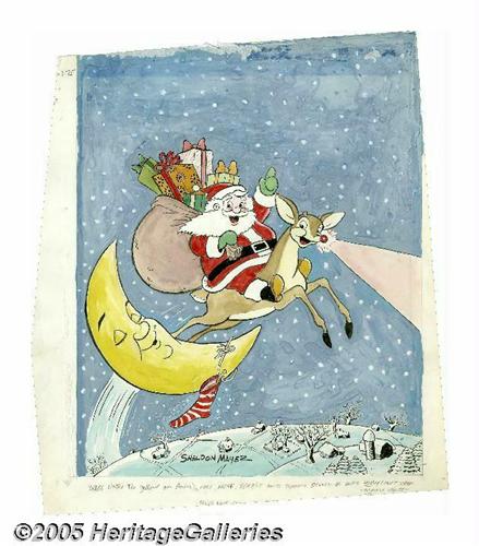 <B>Sheldon Mayer - All-New Collectors' Edition #C-53 Rudolph the Red-Nosed Reindeer Cover Original Art (DC, 1977).</B></I> Sheldon Mayer's whimsical <B>Rudolph the Red-Nosed Reindeer</B></I> covers were a delightful DC Christmas tradition. In addition to his own title, Rudolph also appeared on some of the later covers of DC's treasury-sized titles, <B>Limited Collectors' Edition</B></I> and <B>All-New Collectors' Edition</B></I>. This Yuletide scene was drawn in ink for publication, and later hand-colored with watercolor by Mayer. The image area is 12" x 15". The paper was trimmed right to the top edge of the image, and the other borders were trimmed irregularly outside of the image area; otherwise the art is in Excellent condition. A sensational show-stopper for a Sheldon Mayer enthusiast!