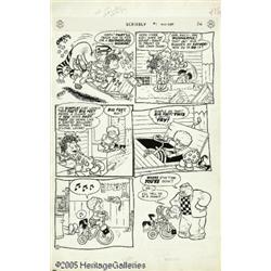 <B>Sheldon Mayer - Scribbly #1, page 2 Original Art (DC, 1948).</B></I> The great Sheldon Mayer remains one of the most talented cartoonists/creators ever to work in the comic book field. His unique and memorable creations include <B>Sugar and Spike</B></I>, <B>The Three Mouseketeers</B></I>, <B>Doodles Duck</B></I> and even the superheroes of <B>The Justice Society of America</B></I> and The Black Orchid. As a comic artist, Mayer created many great comics and gags, one of which was <B>Scribbly</B></I>, a semi-autobiographical strip about a boy cartoonist, which ran intermittently through the late 1930s and '40s. In 1948, when the superhero fad had run its course and Archie-style teenage humor was an up-and-coming genre, <B>Scribbly</B></I> returned as the star of his own comic and ran 15 issues, from 1948 through 1952. This heaping helping of Mayer madness has an image area of 13" x 18" and is in Excellent condition.