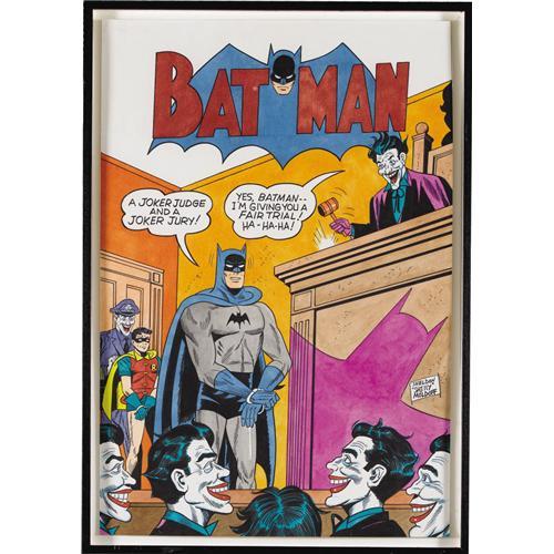<B>Sheldon Moldoff - Batman #163 Cover Recreation Original Art (undated).</B></I> It's no laughing matter when Batman finds himself tried by a Joker judge and jury! Sheldon Moldoff captures this surreal spectacle from the very end of the pre-"New Look" Batman. The "New Look" was ushered in with the very next issue, Batman #164. The art is in Excellent condition and has been framed to an overall size of 16.5" x 23.5".<BR><BR><b>Shipping:</b> Framed - with Glass, Small (<a target="_blank" href="http://www.heritageauctions.com/common/shipping.php">view shipping information</a>)