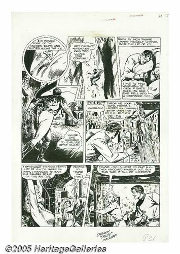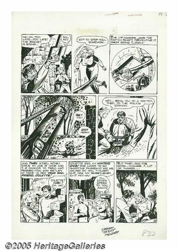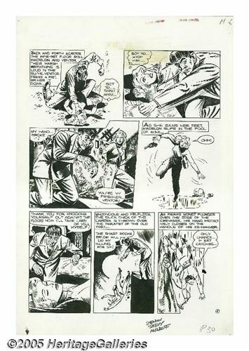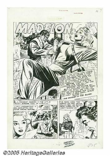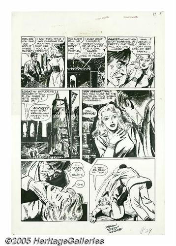 <B>Sheldon Moldoff - Crime Patrol #7, Complete 8-page Story, "The Rocket in the Ruins!" Original Art (EC, 1948).</B></I> Only a frail girl stands between a madman and the destruction of gay Paris. Crime Patroller Madelon will die willingly to save the City of Lights! Set high in the Cottian Alps linking France and Italy, this international tale of intrigue is a true treasure for fans of Sheldon "Shelly" Moldoff. Moldoff's bold brush work and elegantly placed shadows are balanced with an attention to detail that thrills! The image area of each page measures 13" x 18". The title type has slipped off the top of each page, leaving a slight stain, outside of the image area, otherwise these pages average Excellent condition.
