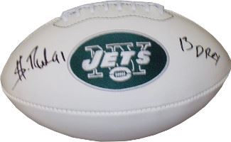 On July 25, 2013, Sheldon Richardson signed a four-year $10.05 million deal. He was named the starting defensive end in the 2013 season. During the month of November, Richardson won the NFL Rookie of the Month award. In a week 15 game against the Panthers, Richardson became the first NFL defensive lineman to score a rushing touchdown since B.J. Raji did so for the Green Bay Packers in 2011. He ran for his second career touchdown of the season in the Jets' week 17 finale against Miami. Richardson played 16 games in 2013 making 78 tackles, a pass defended, a forced fumble, 3.5 sacks, and 2 rushing touchdowns. On February 2, 2014, it was announced that Richardson had won the 2013 NFL Defensive Rookie of the Year award. Sheldon Richardson has hand signed this New York Jets White Logo Football with 13 DROY inscription. MAB Hologram and Certificate of Authenticity from Athlon Sports.