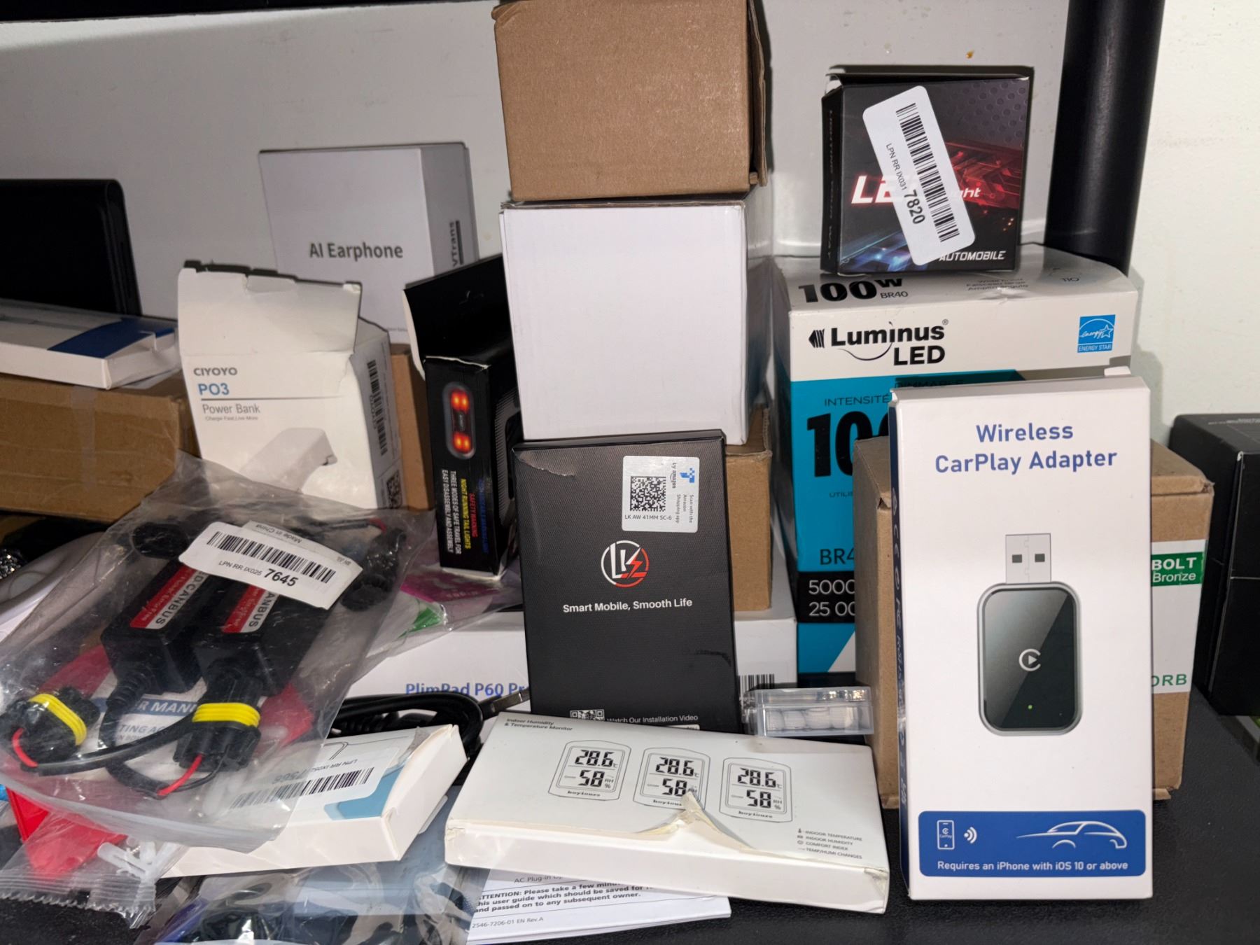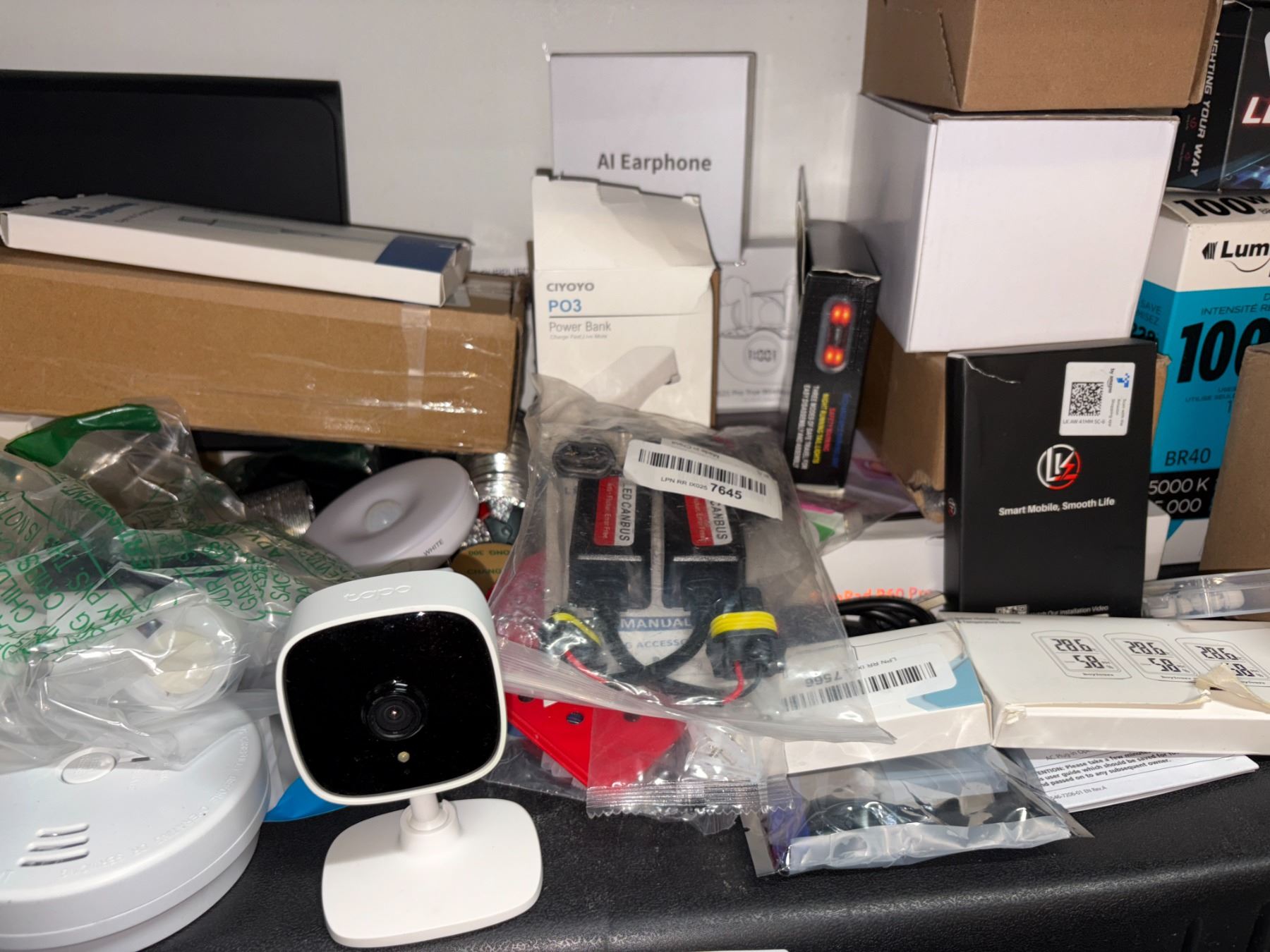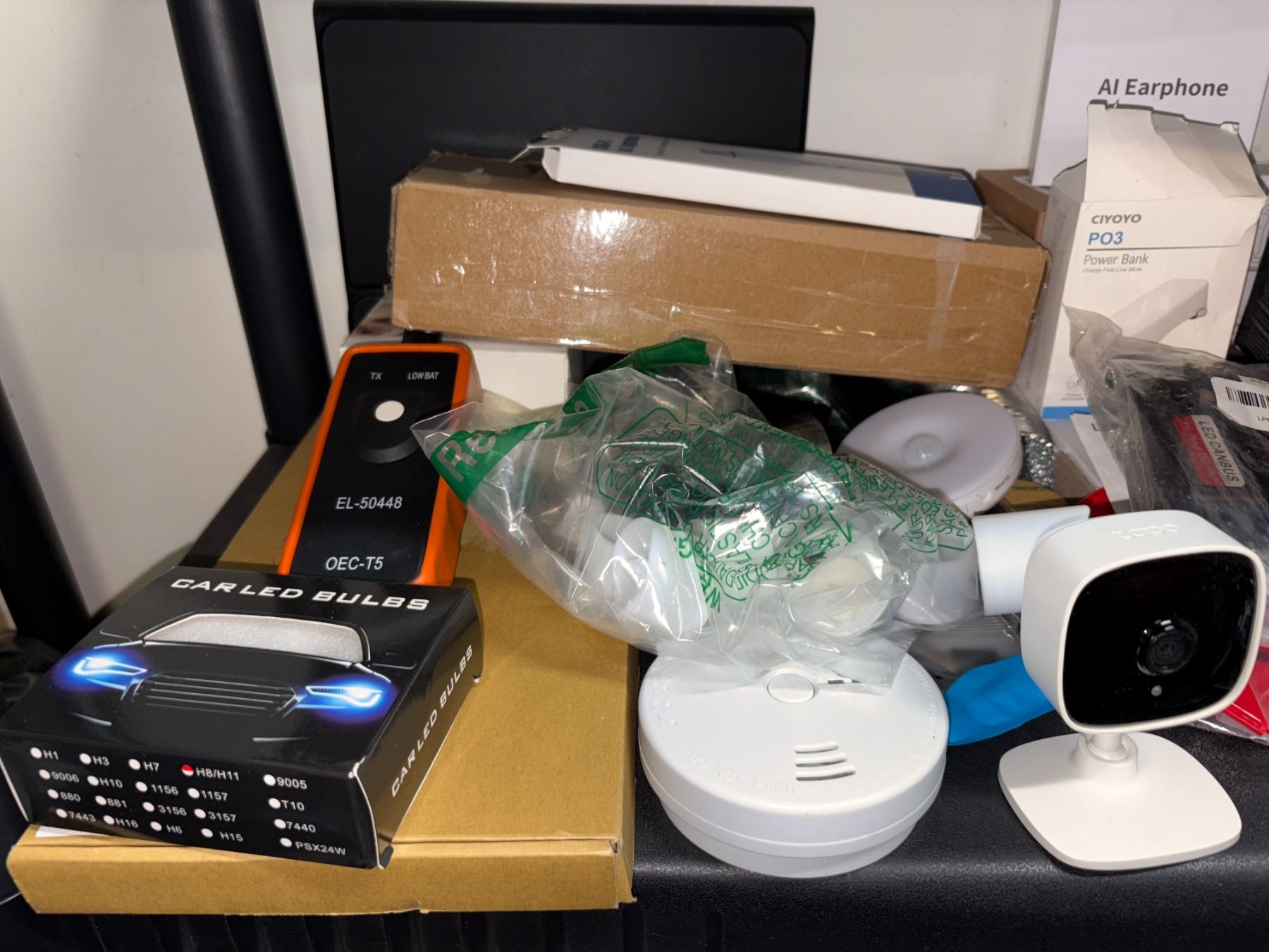 Shelf Lot Full Of Assorted Electronics- Camera, Wireless Carplay Adapter/ Smoke Alarm/Luminious Bulb Etc