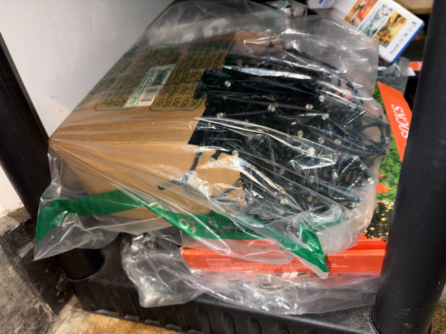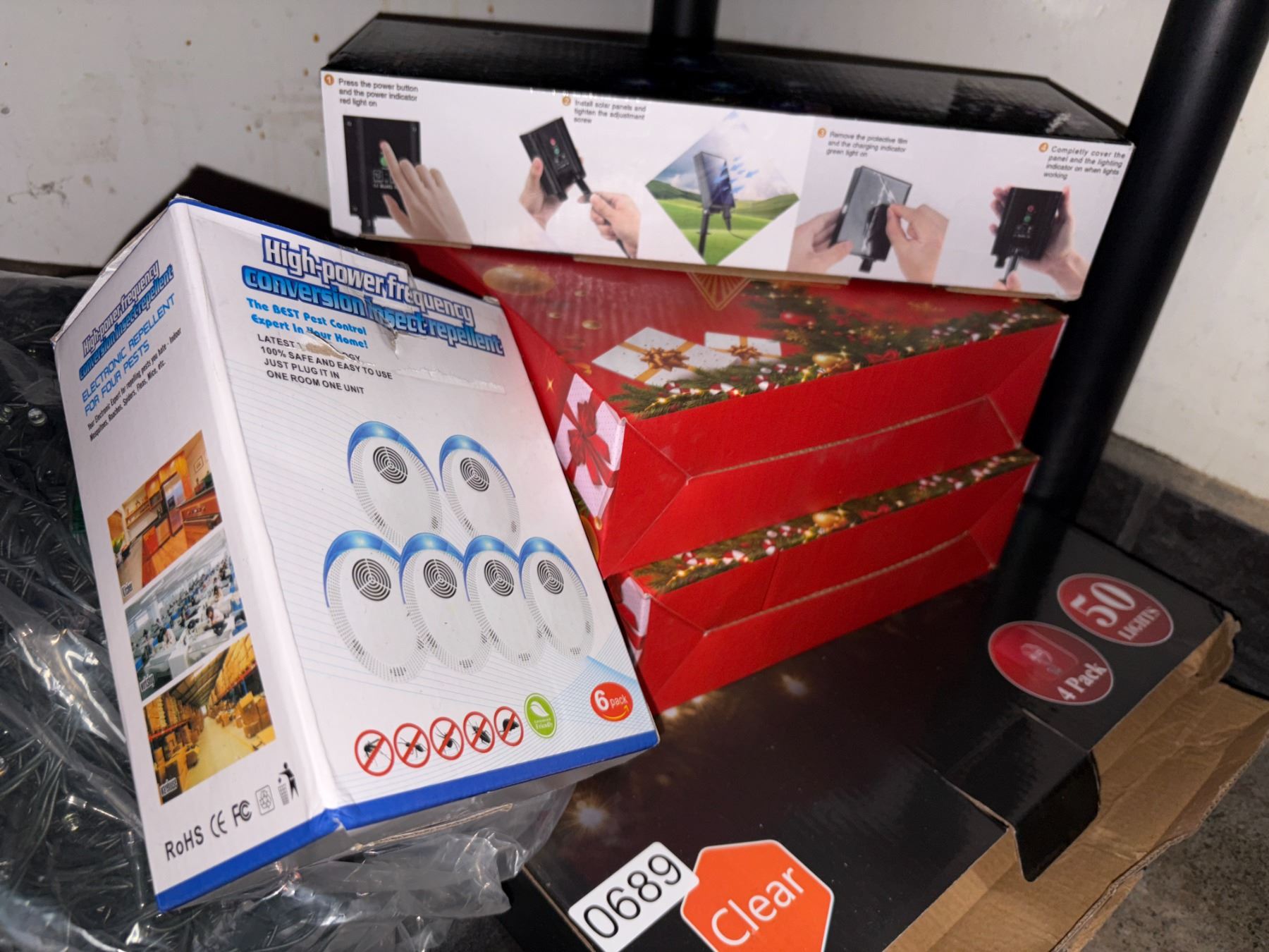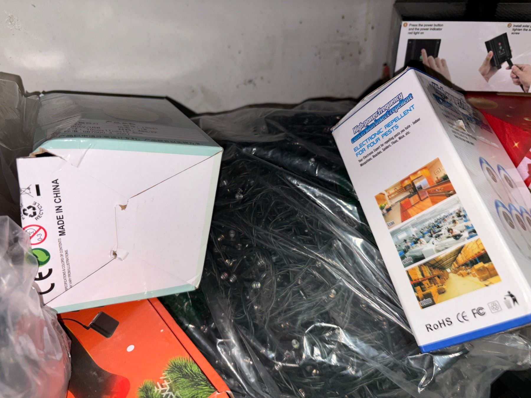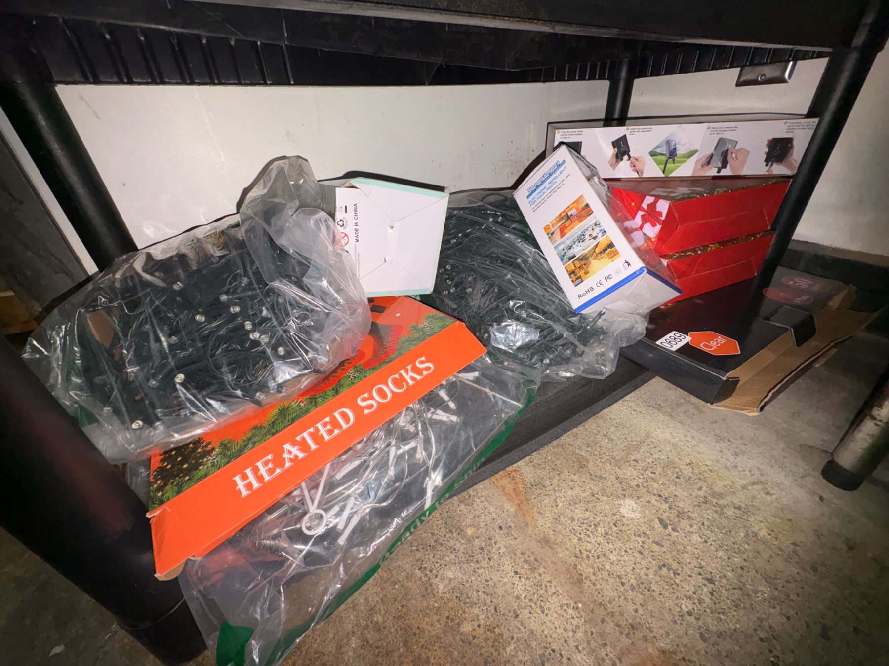 Shelf Lot Full Of Assorted Electronics Includes Christmas Décor, String Lights, Hest Controller Insect Repellent, Heated Socks, Etc