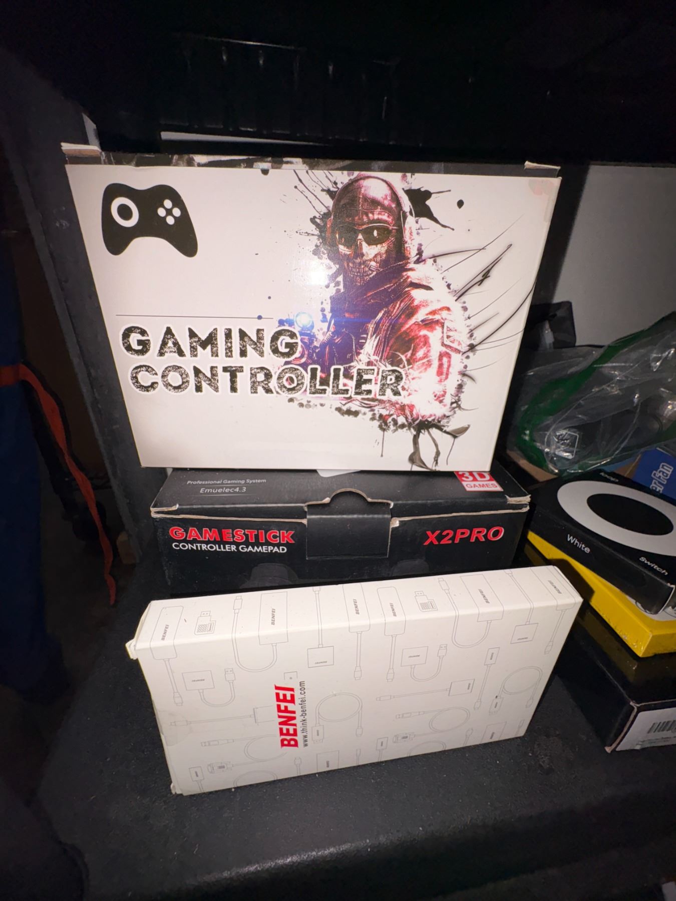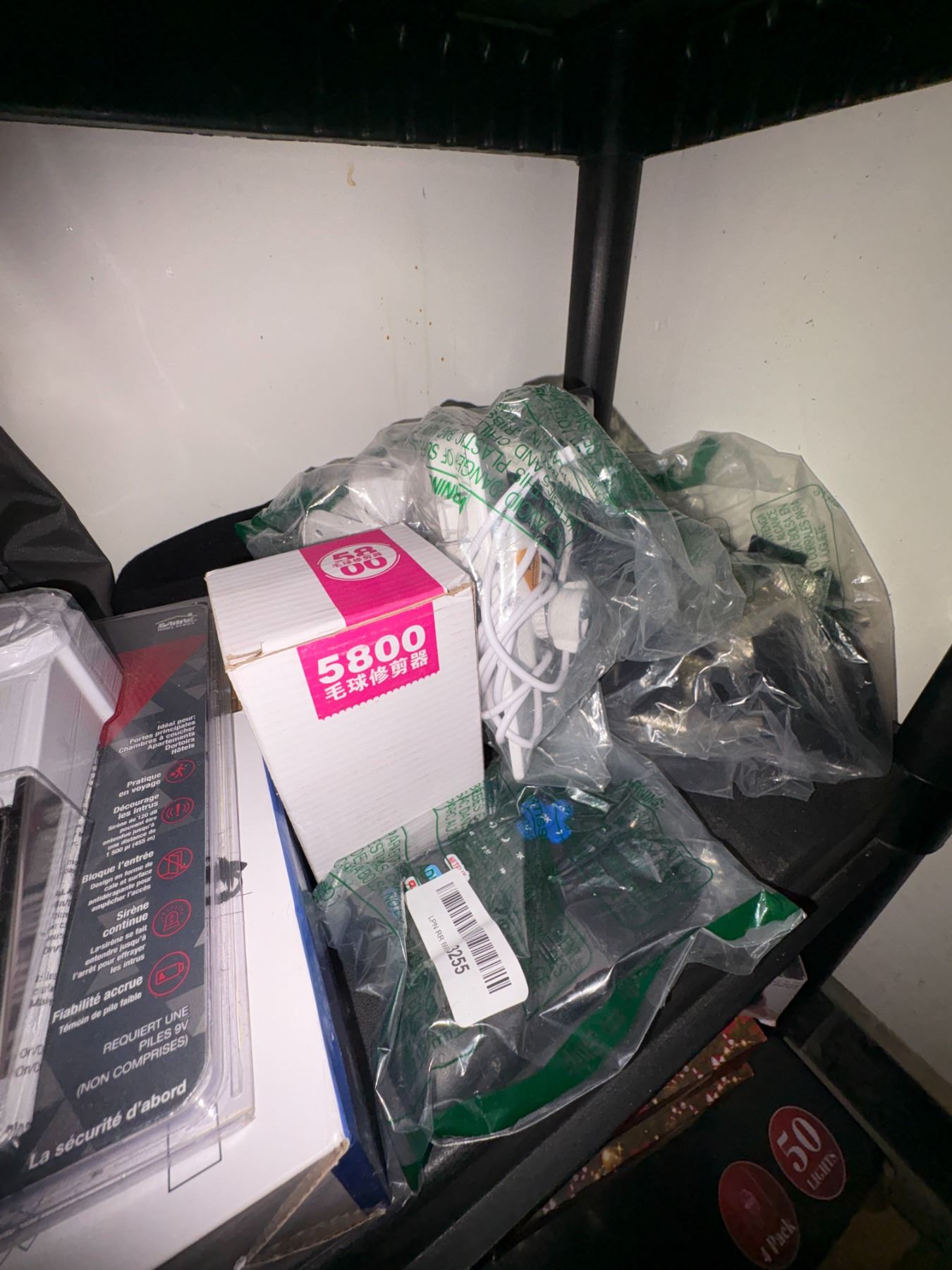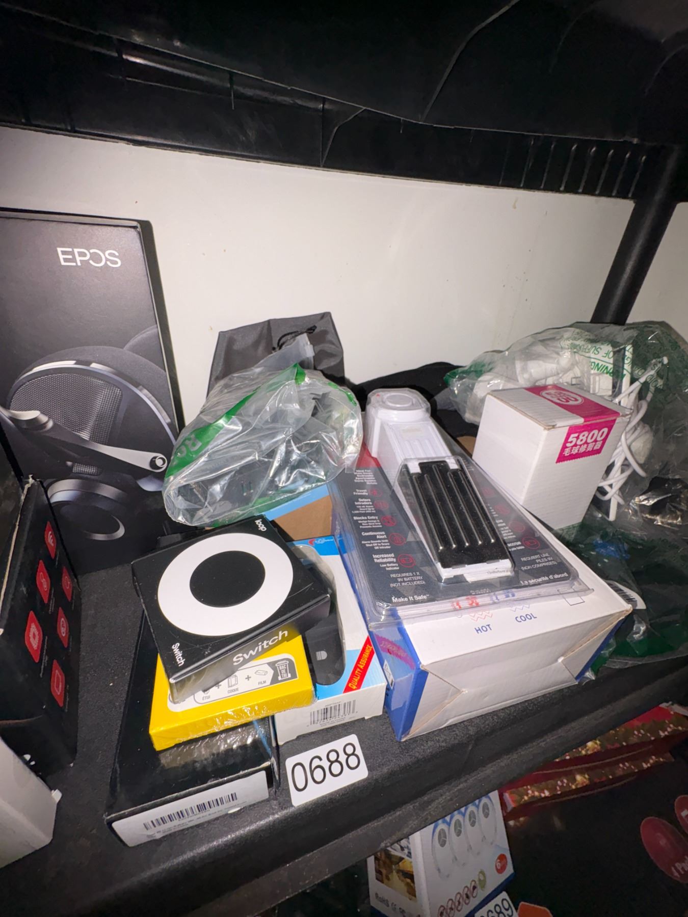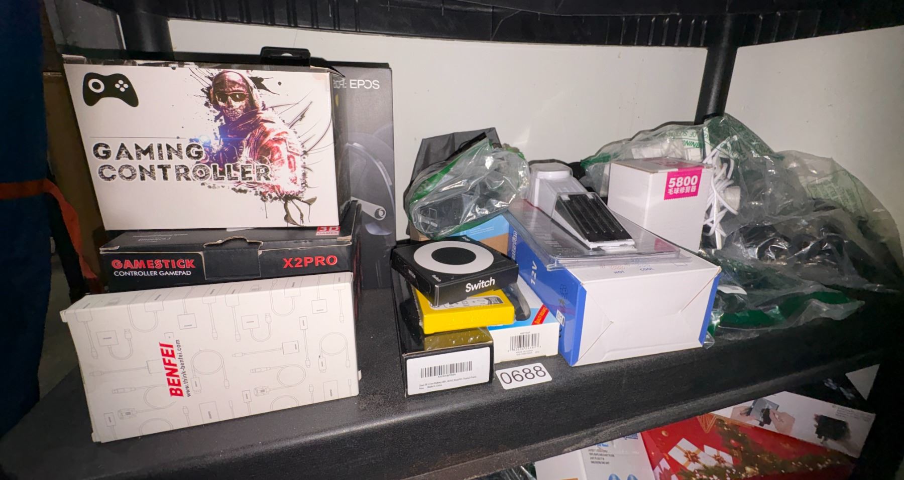 Shelf Lot Full Of Assorted Electronics Includes Gaming Controller, Door Stop Alarm, Auto Heater Fan, Remotes, Etc