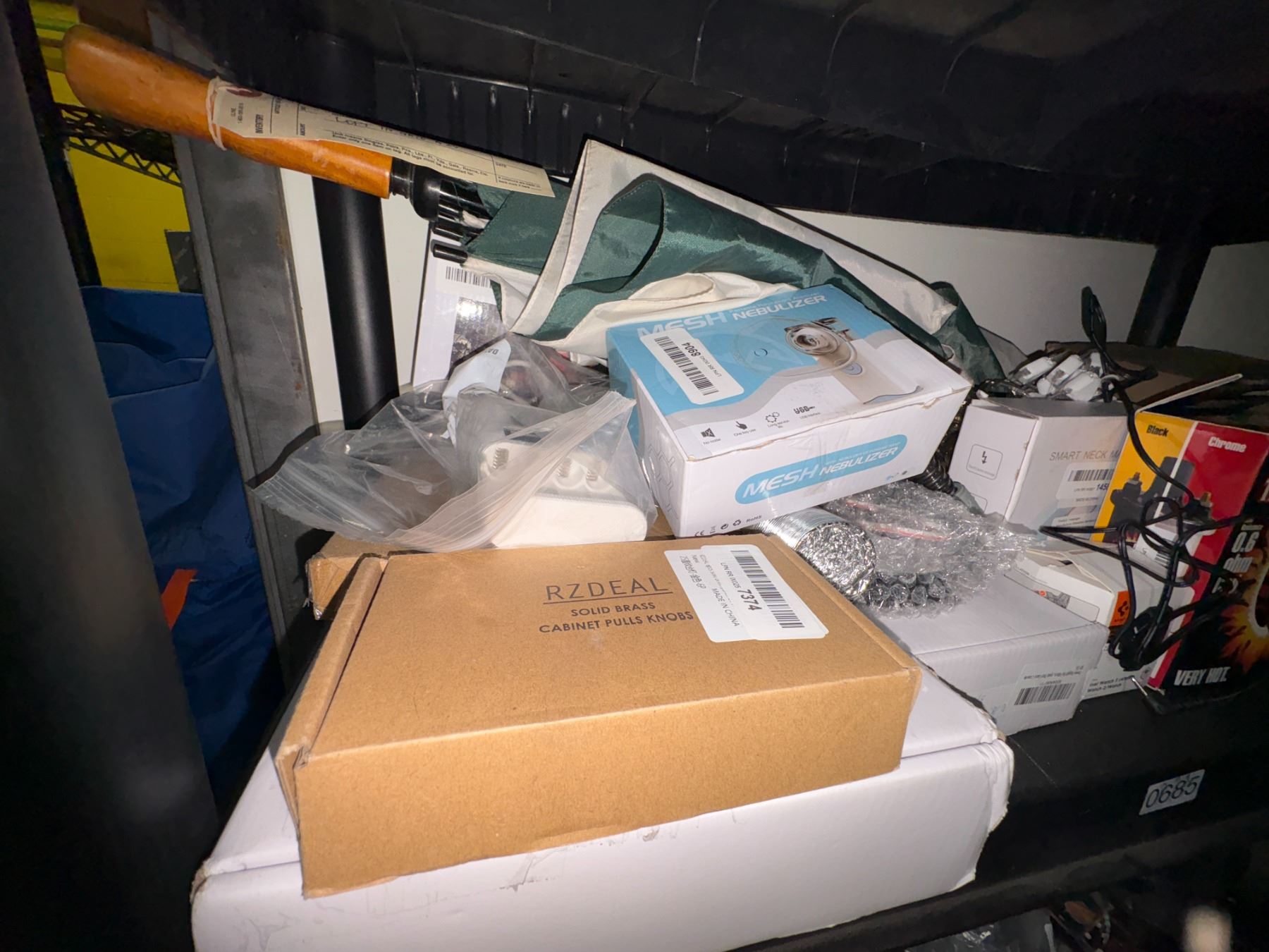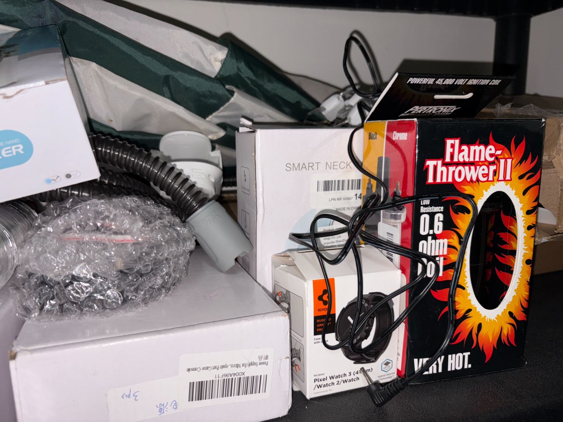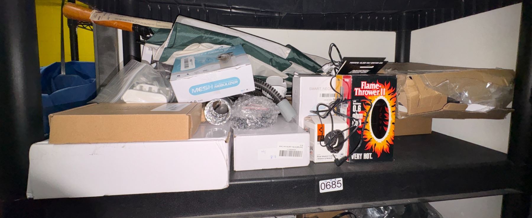 Shelf Lot Full Of Assorted Electronics - Pixel Watchh 3 Case With Band, Portable House Hold Atomizer Nebulizer Battery Charger With Batteries