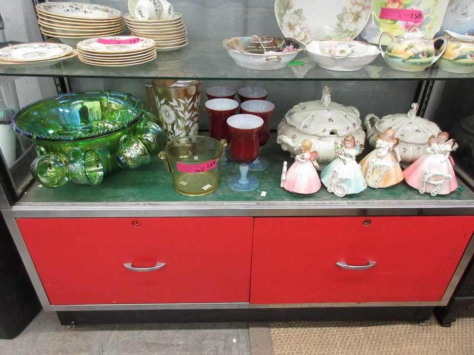Carnival glass punchbowl, porcelain tureens, vaseline glass & more