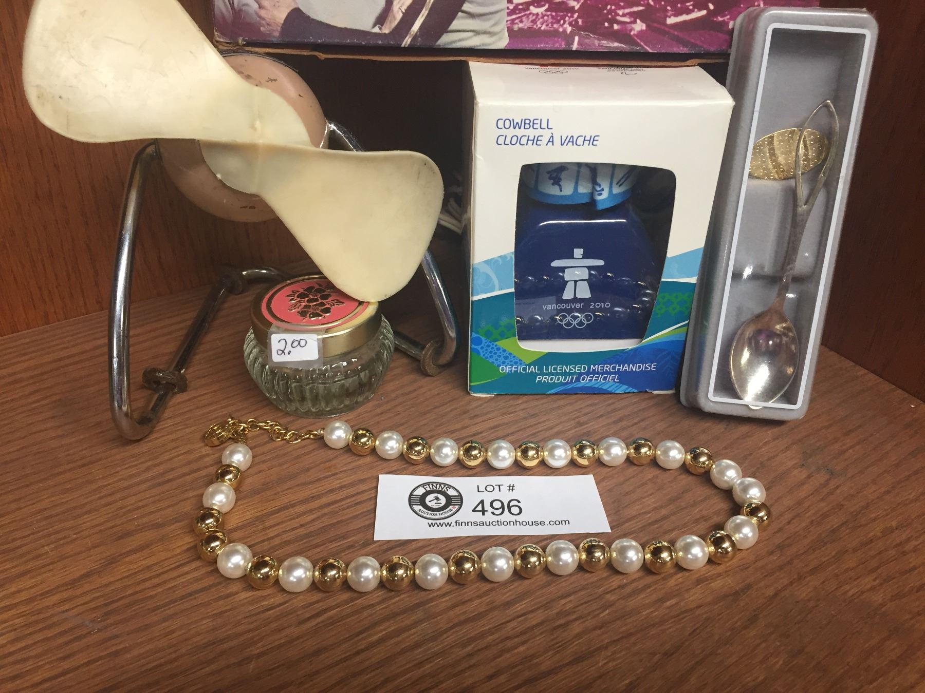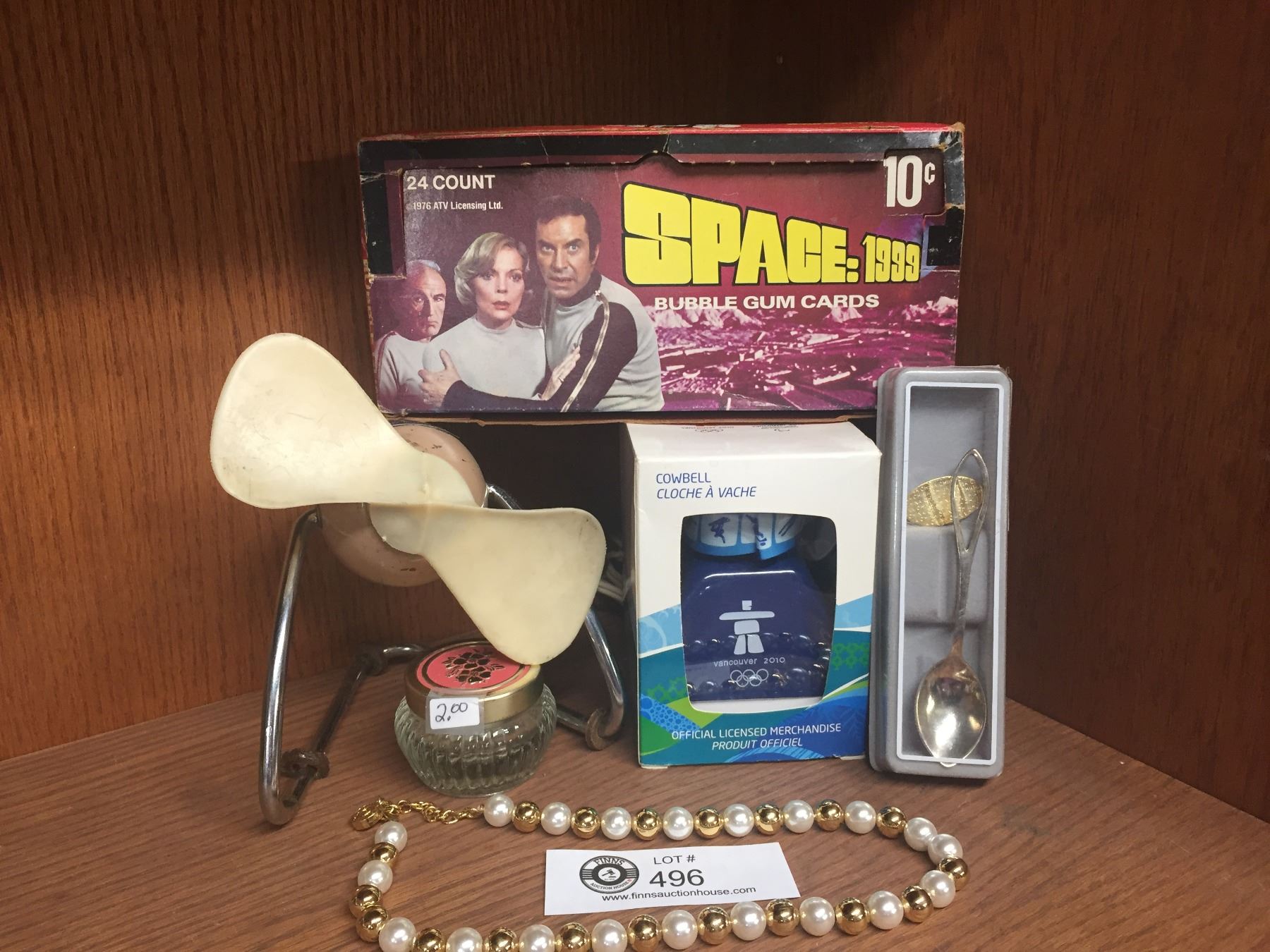 Shelf Lot of Collectibles. Space 1999 Bubble Gum Card Box from 1976, Vancouver Olympics Cowbell, Vintage Desk Fan, Bracelet, and a Souvenir Spoon