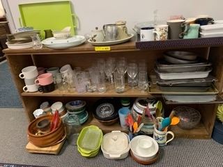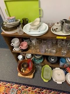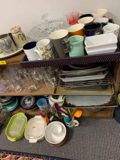 Shelf Lot of Misc. Estate Kitchenware Items (shelf not included) Glassware, Pitchers, Vintage Serving Trays, Wood Bowls and More.