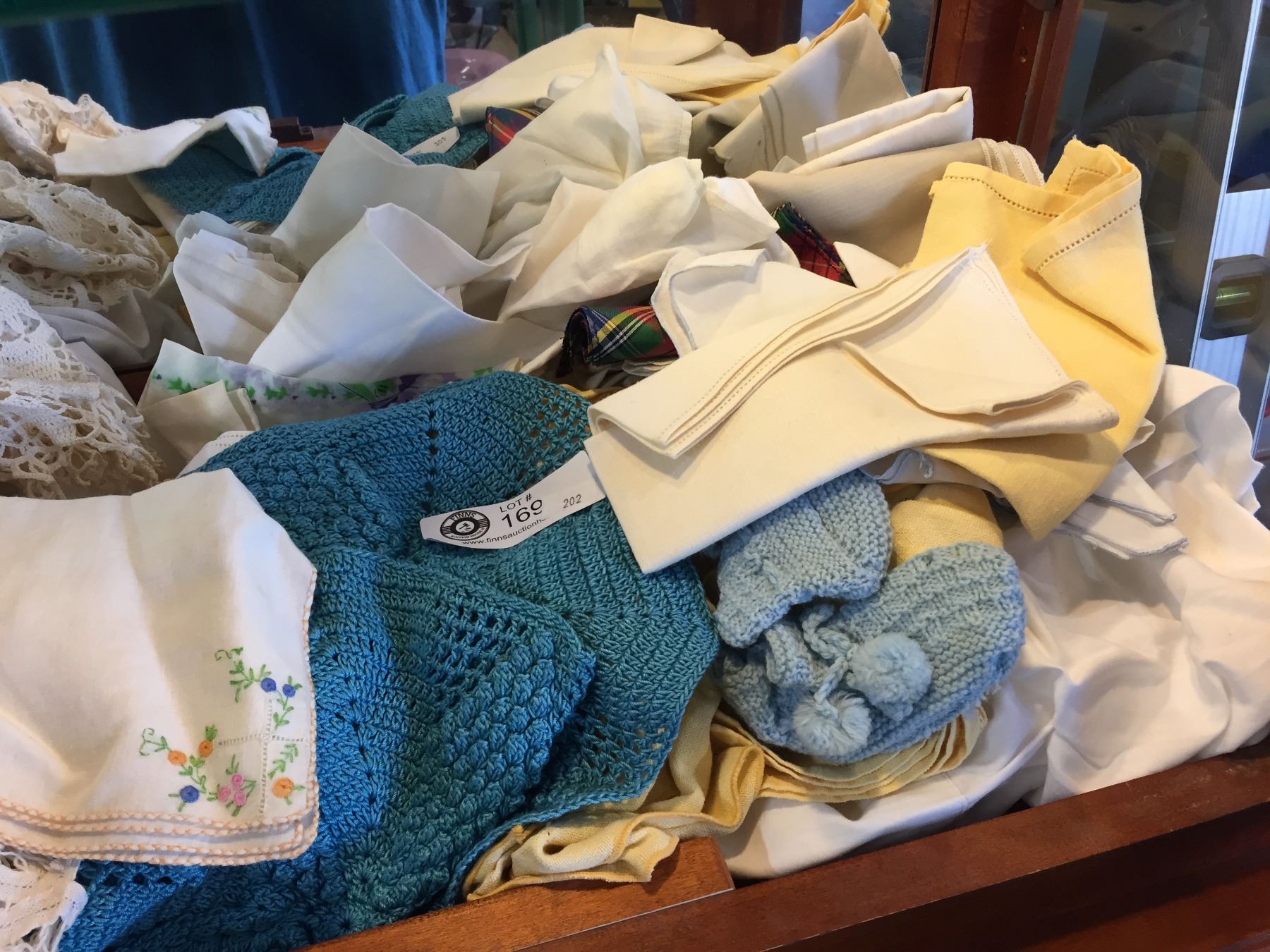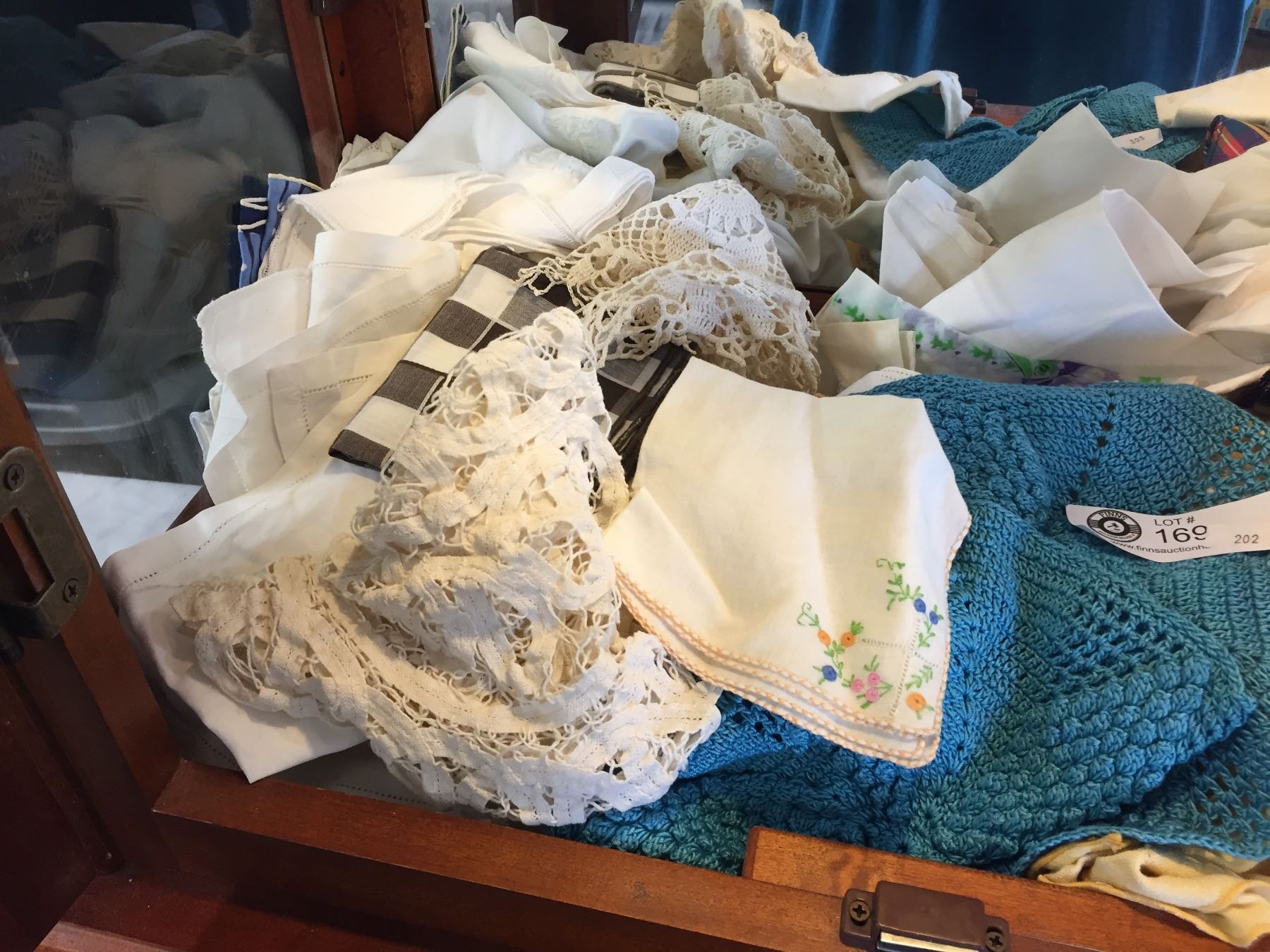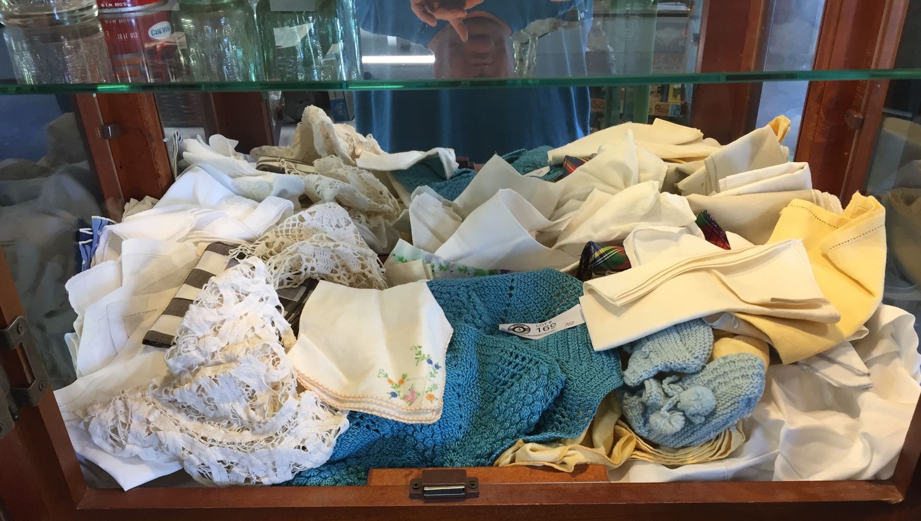 Shelf Lot of Vintage Linens, Doiles etc.