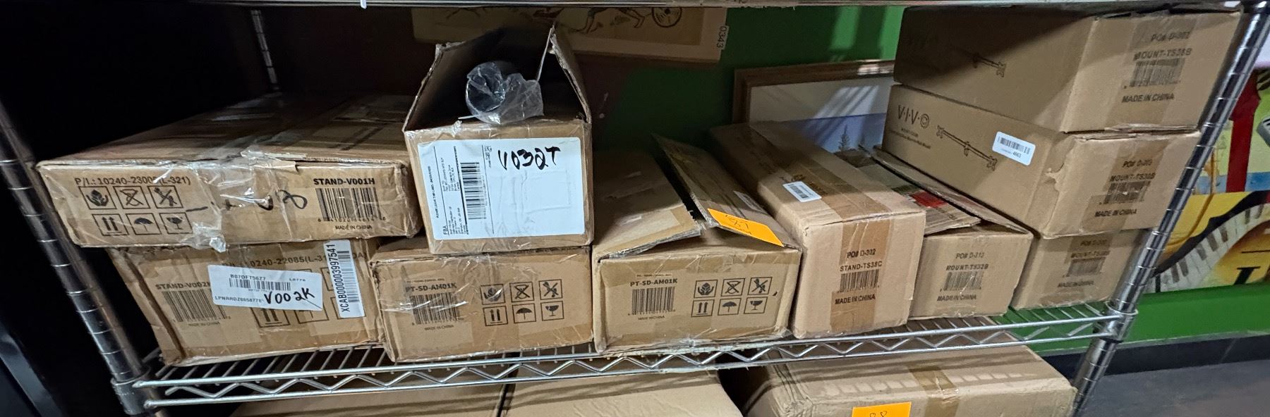 Shelf full of assorted VIVO monitor desk mounts & stands (refurbished in boxes)