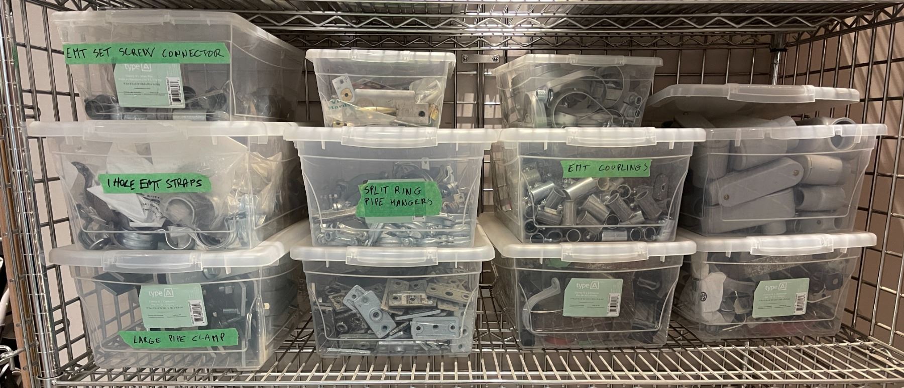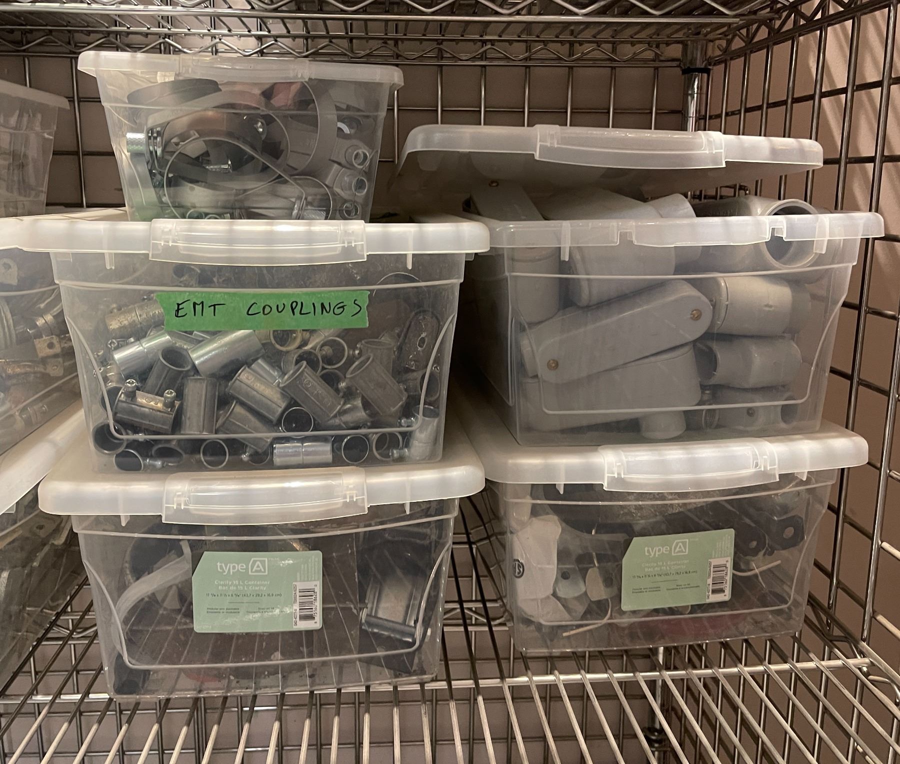 Shelf lot full of industrial misc items - includes EMT set screw connectors / large pipe clamps / split rings / pipe hangers etc