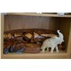 Shelf lot of Wolf Sculptures, deco duck, carved masks, onyx elephant etc.