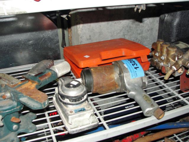Shelf lot of assorted air tools, vices, electric