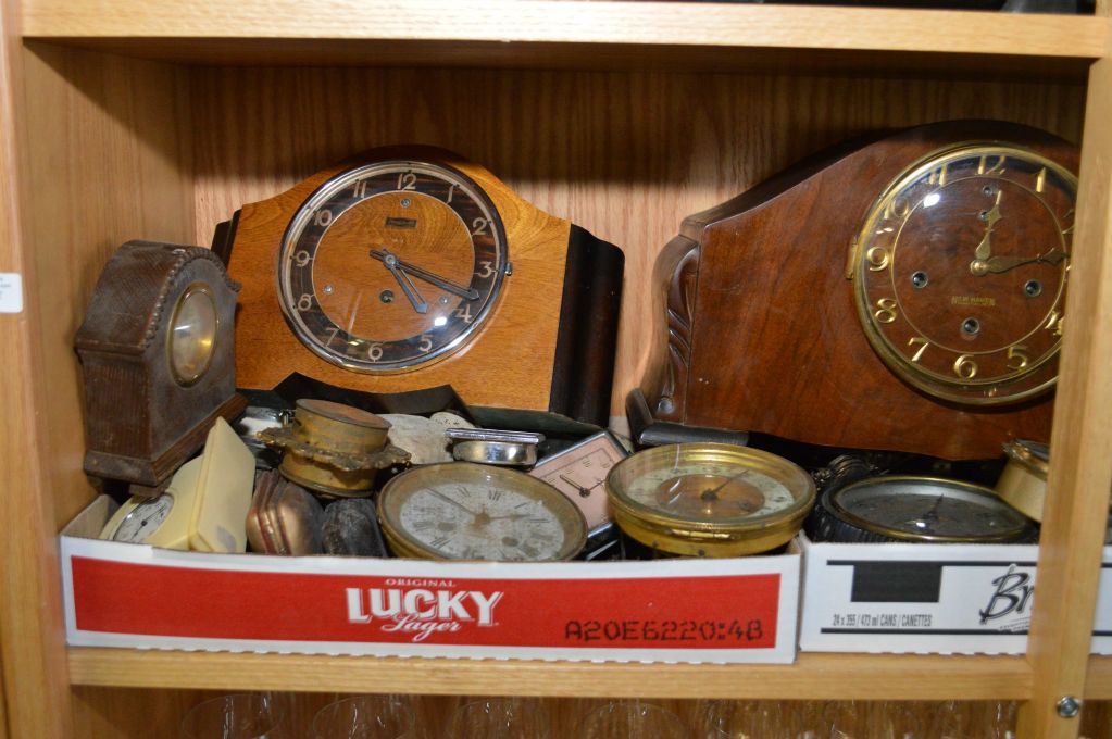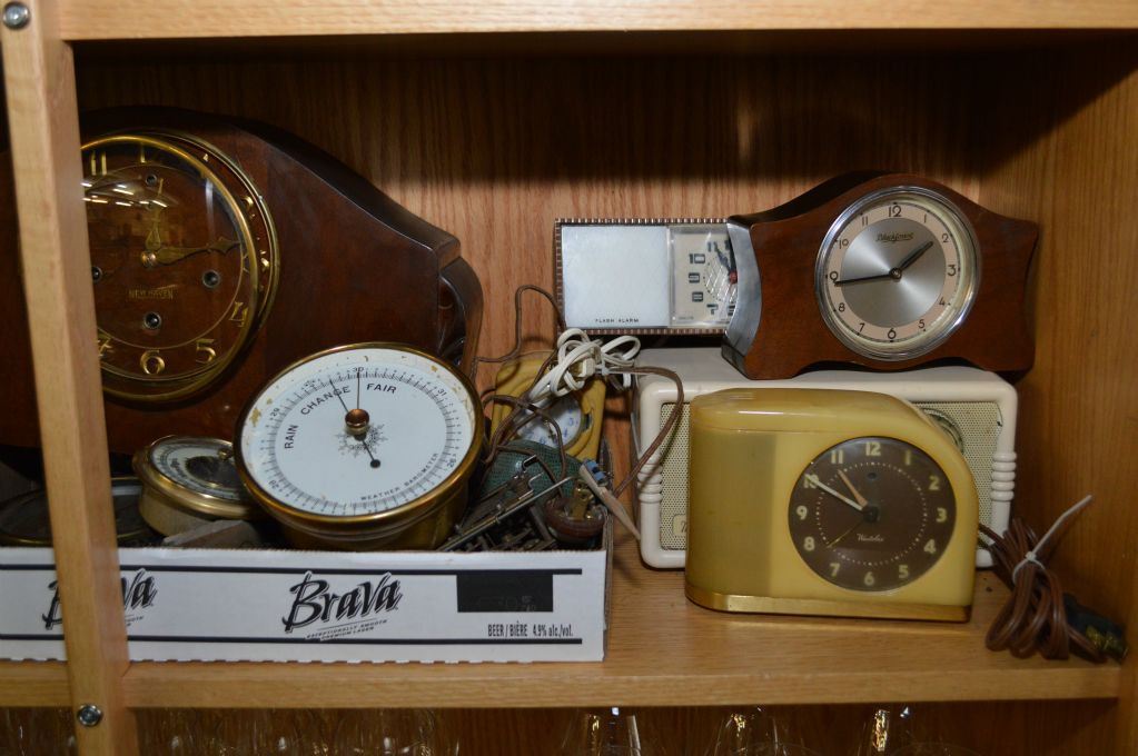 ITEMS NOT AVAILABLE FOR SHIPPING. LOCAL BIDDERS ONLY. Shelf lot of assorted clocks including mantle, travel, etc plus barometers and parts