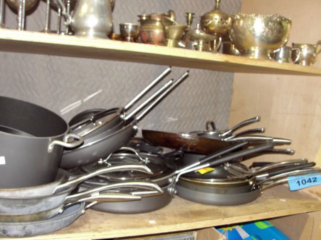 Shelf lot of assorted cookware; pots, pans etc
